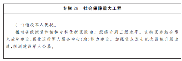 推動(dòng)養(yǎng)老事業(yè)和養(yǎng)老產(chǎn)業(yè)協(xié)同發(fā)展,發(fā)展普惠型養(yǎng)老服務(wù)和互助性養(yǎng)老,支持家庭承擔(dān)養(yǎng)老功能,構(gòu)建居家社區(qū)機(jī)構(gòu)相協(xié)調(diào)、醫(yī)養(yǎng)康養(yǎng)相結(jié)合的養(yǎng)老服務(wù)體系。健全基本養(yǎng)老服務(wù)體系,夯實(shí)公辦養(yǎng)老院的兜底功能,深化公辦養(yǎng)老機(jī)構(gòu)改革,完善公建民營(yíng)管理機(jī)制,支持具有教育培訓(xùn)或療養(yǎng)休養(yǎng)功能的機(jī)構(gòu)轉(zhuǎn)型發(fā)展養(yǎng)老服務(wù),加強(qiáng)對(duì)護(hù)理型、連鎖型民辦養(yǎng)老機(jī)構(gòu)的政策扶持。推進(jìn)公共基礎(chǔ)設(shè)施適老化改造,支持和規(guī)范專(zhuān)業(yè)化機(jī)構(gòu)服務(wù)向社區(qū)延伸,大力發(fā)展社區(qū)嵌入式養(yǎng)老,探索社區(qū)“物業(yè)+養(yǎng)老服務(wù)”模式。深入推進(jìn)醫(yī)養(yǎng)結(jié)合,擴(kuò)大養(yǎng)老機(jī)構(gòu)護(hù)理型床位供給。推廣“黨建+農(nóng)村養(yǎng)老服務(wù)”模式,健全覆蓋縣鄉(xiāng)村三級(jí)的農(nóng)村養(yǎng)老服務(wù)體系。加快推進(jìn)公辦養(yǎng)老機(jī)構(gòu)入住綜合評(píng)估和輪候制度,健全養(yǎng)老服務(wù)綜合監(jiān)管制度。強(qiáng)化老年人權(quán)益保障,提升老年人社會(huì)優(yōu)待水平。