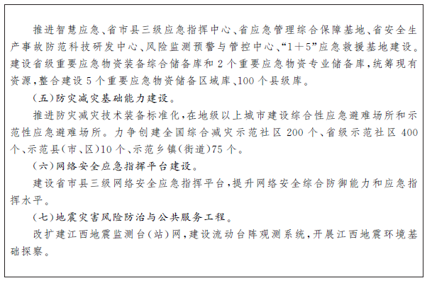 健全完善安全生產(chǎn)責(zé)任和管理制度,加快建立公共安全風(fēng)險(xiǎn)排查和隱患治理體系。強(qiáng)化企業(yè)主體責(zé)任落實(shí),加強(qiáng)危險(xiǎn)化學(xué)品、煙花爆竹、礦山、建筑施工、交通、消防等重點(diǎn)領(lǐng)域安全生產(chǎn)監(jiān)管執(zhí)法,有效遏制重特大公共安全事故。強(qiáng)化生物安全保障,提高食品藥品等關(guān)系人民健康產(chǎn)品和服務(wù)的安全監(jiān)管水平,強(qiáng)化疫苗等高風(fēng)險(xiǎn)品種監(jiān)管。建立高效科學(xué)的自然災(zāi)害防治體系,提升洪澇干旱、森林火災(zāi)、地質(zhì)災(zāi)害、氣象災(zāi)害、地震等自然災(zāi)害防御工程標(biāo)準(zhǔn),推進(jìn)防災(zāi)抗災(zāi)重大基礎(chǔ)設(shè)施建設(shè)。完善應(yīng)急管理體制機(jī)制,強(qiáng)化應(yīng)急管理基礎(chǔ)和應(yīng)急救援隊(duì)伍建設(shè)。加快構(gòu)建政府、企業(yè)、第三方等多方聯(lián)動(dòng)的應(yīng)急物資保障體系,合理確定省級(jí)儲(chǔ)備和市縣級(jí)儲(chǔ)備、政府儲(chǔ)備和企業(yè)儲(chǔ)備、實(shí)物儲(chǔ)備和產(chǎn)能儲(chǔ)備規(guī)模,完善物資儲(chǔ)備、動(dòng)用應(yīng)急預(yù)案。發(fā)展巨災(zāi)保險(xiǎn)。