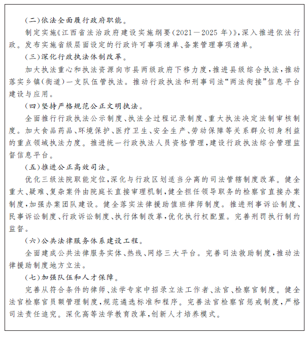 深入貫徹習(xí)近平法治思想,堅(jiān)持依法治省、依法執(zhí)政、依法行政共同推進(jìn),法治江西、法治政府、法治社會(huì)一體建設(shè),健全完善黨內(nèi)法規(guī),全面推進(jìn)科學(xué)立法、嚴(yán)格執(zhí)法、公正司法、全民守法。