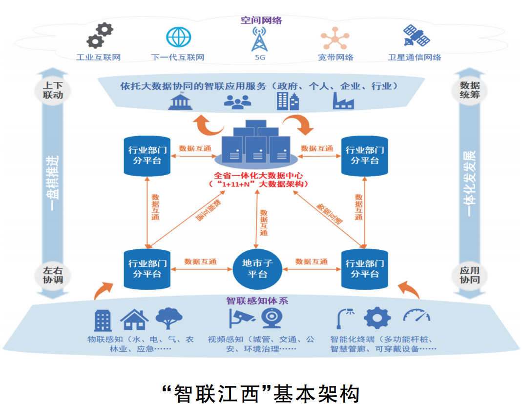 按照“三聯(lián)一智”基本框架,堅(jiān)持全省“一盤棋、一體化”、統(tǒng)分結(jié)合、聯(lián)動(dòng)協(xié)同推進(jìn)“智聯(lián)江西”建設(shè)。
