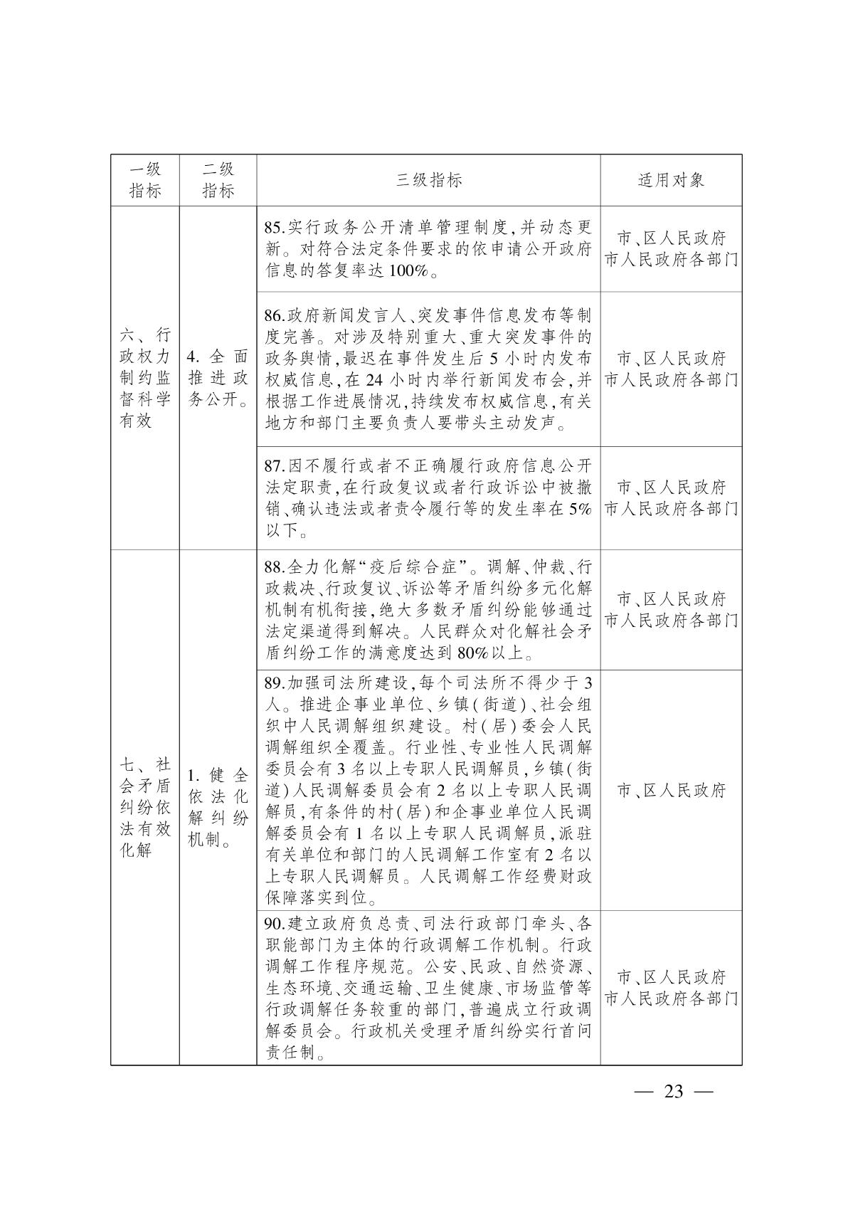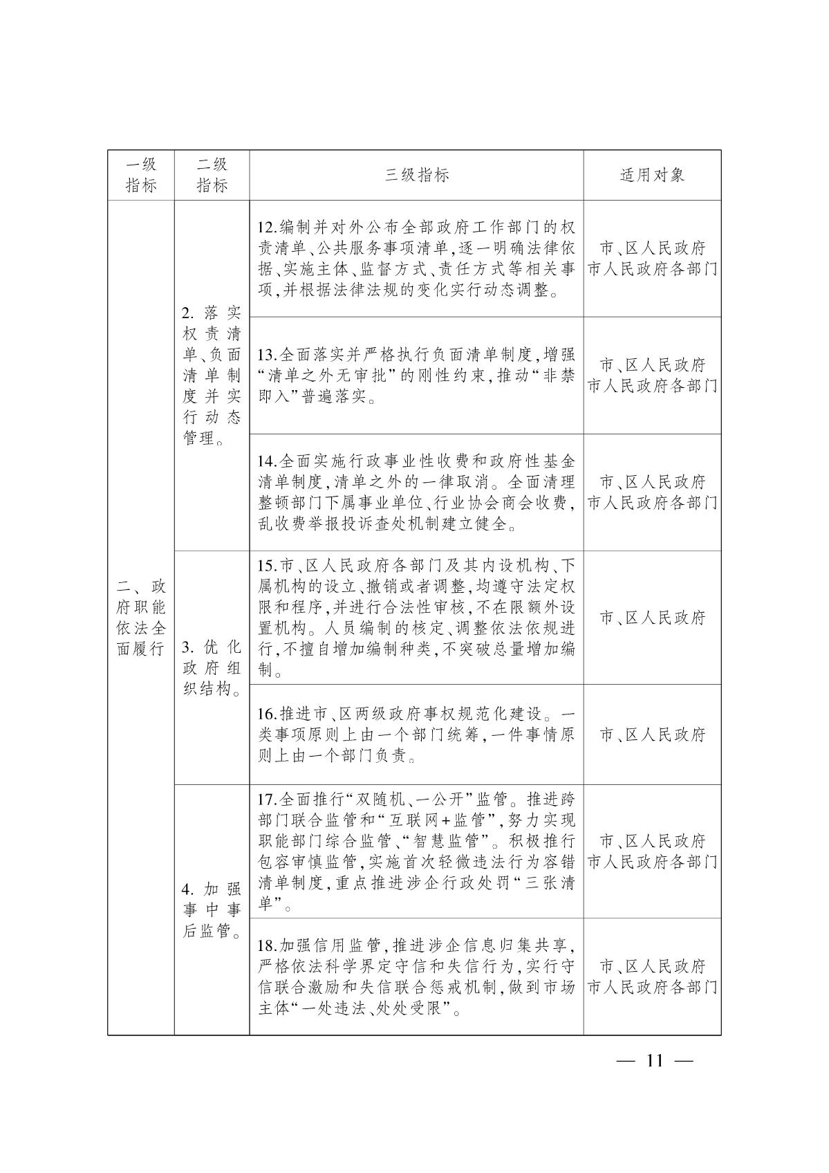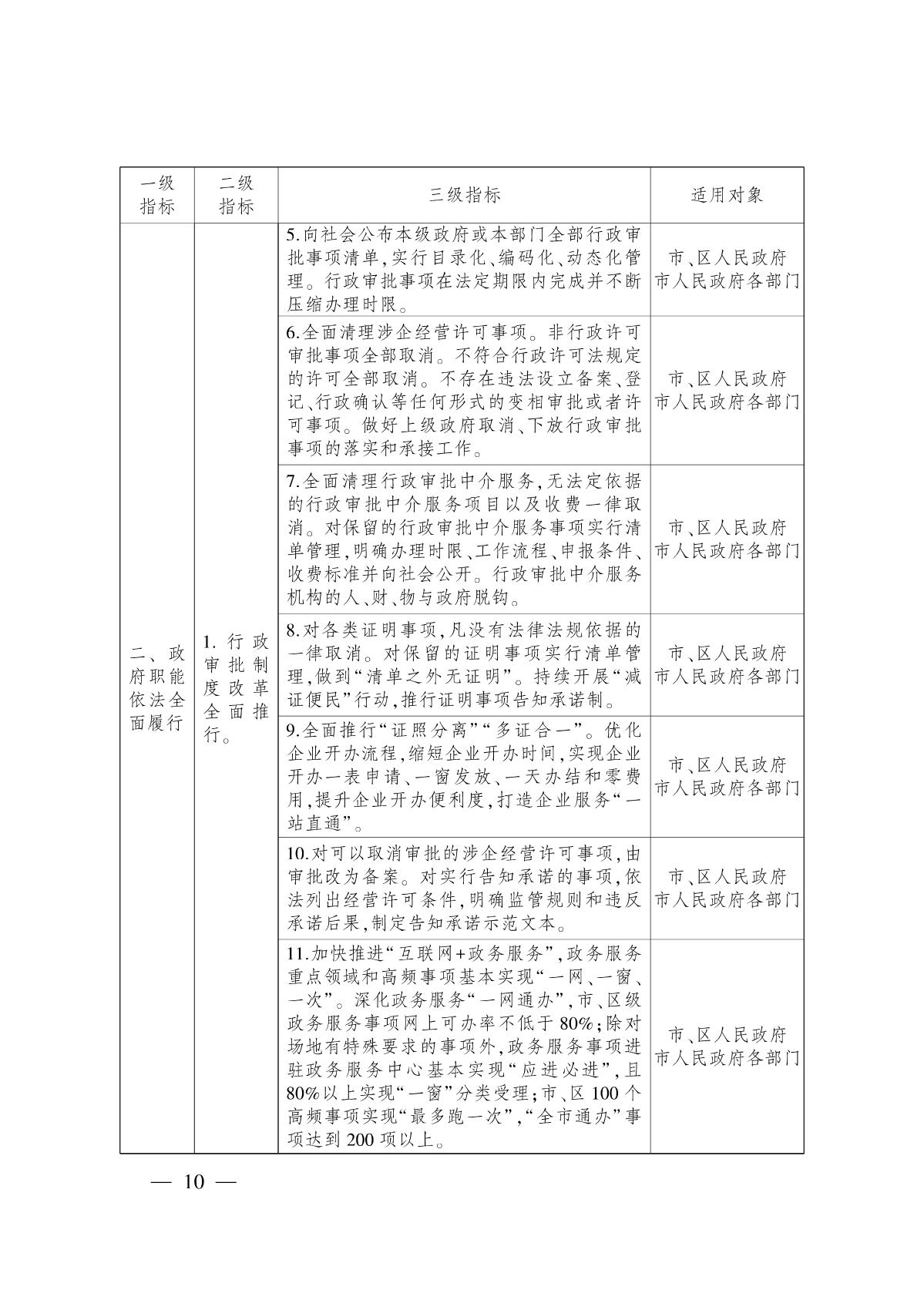 (二)依法全面履行政府職能,打造一流法治化營(yíng)商環(huán)境。深化簡(jiǎn)政放權(quán)、放管結(jié)合、優(yōu)化服務(wù)改革,加快推進(jìn)數(shù)字政府建設(shè),重點(diǎn)推進(jìn)政務(wù)服務(wù)“一網(wǎng)通辦”、政府運(yùn)行“一網(wǎng)協(xié)同”、民生服務(wù)“一碼互聯(lián)”、企業(yè)服務(wù)“一站直通”,著力打造全國(guó)政務(wù)服務(wù)最優(yōu)城市。持續(xù)營(yíng)造法治化營(yíng)商環(huán)境,調(diào)整優(yōu)化權(quán)責(zé)清單管理,實(shí)施統(tǒng)一的市場(chǎng)準(zhǔn)入負(fù)面清單制度。加強(qiáng)和創(chuàng)新事中事后監(jiān)管,推進(jìn)“雙隨機(jī)、一公開”跨部門聯(lián)合監(jiān)管,強(qiáng)化重點(diǎn)領(lǐng)域重點(diǎn)監(jiān)管。持續(xù)開展“減證便民”行動(dòng),推行證明事項(xiàng)告知承諾制。依法實(shí)施應(yīng)急處置措施,全面提高依法應(yīng)對(duì)突發(fā)事件能力和水平。