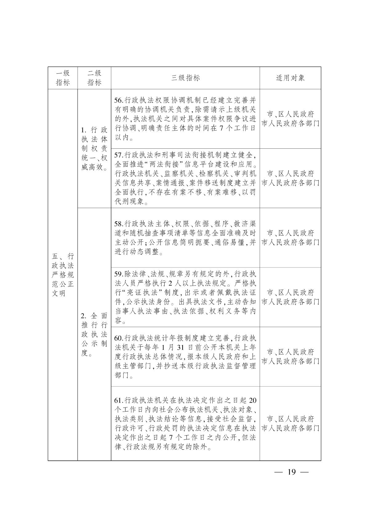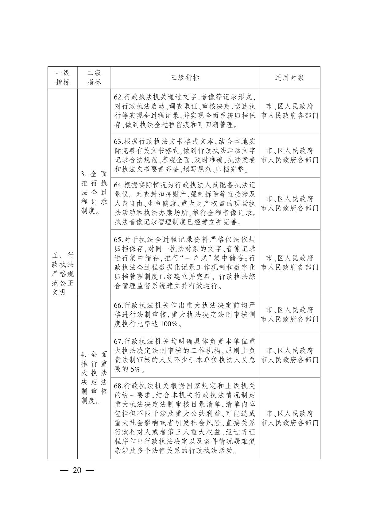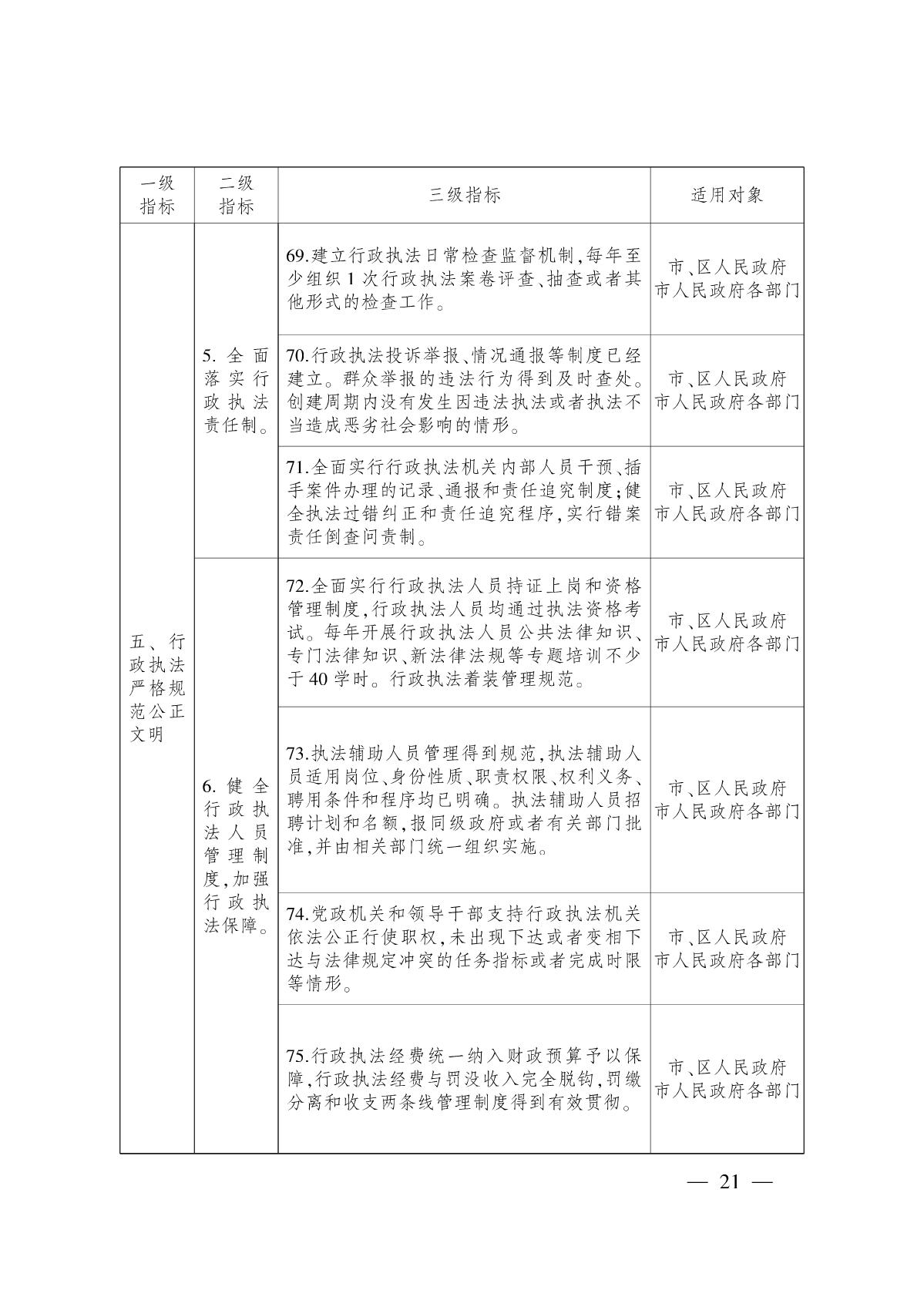 (五)促進(jìn)嚴(yán)格規(guī)范公正文明執(zhí)法,提升行政執(zhí)法能力和公信力。深化行政執(zhí)法體制改革,落實(shí)綜合執(zhí)法改革要求,繼續(xù)探索實(shí)行跨領(lǐng)域跨部門綜合執(zhí)法。全面推進(jìn)武漢市行政執(zhí)法管理與監(jiān)督云平臺(tái)建設(shè)和應(yīng)用,改進(jìn)和創(chuàng)新執(zhí)法方式,規(guī)范執(zhí)法自由裁量權(quán),健全行政執(zhí)法和刑事司法銜接機(jī)制。全面推行涉企行政處罰“三張清單”,實(shí)施包容審慎執(zhí)法。全面推行行政執(zhí)法公示制度、執(zhí)法全過程記錄制度、重大執(zhí)法決定法制審核制度,加大重點(diǎn)領(lǐng)域執(zhí)法力度。嚴(yán)格落實(shí)行政執(zhí)法責(zé)任制和責(zé)任追究制,加強(qiáng)行政執(zhí)法監(jiān)督。