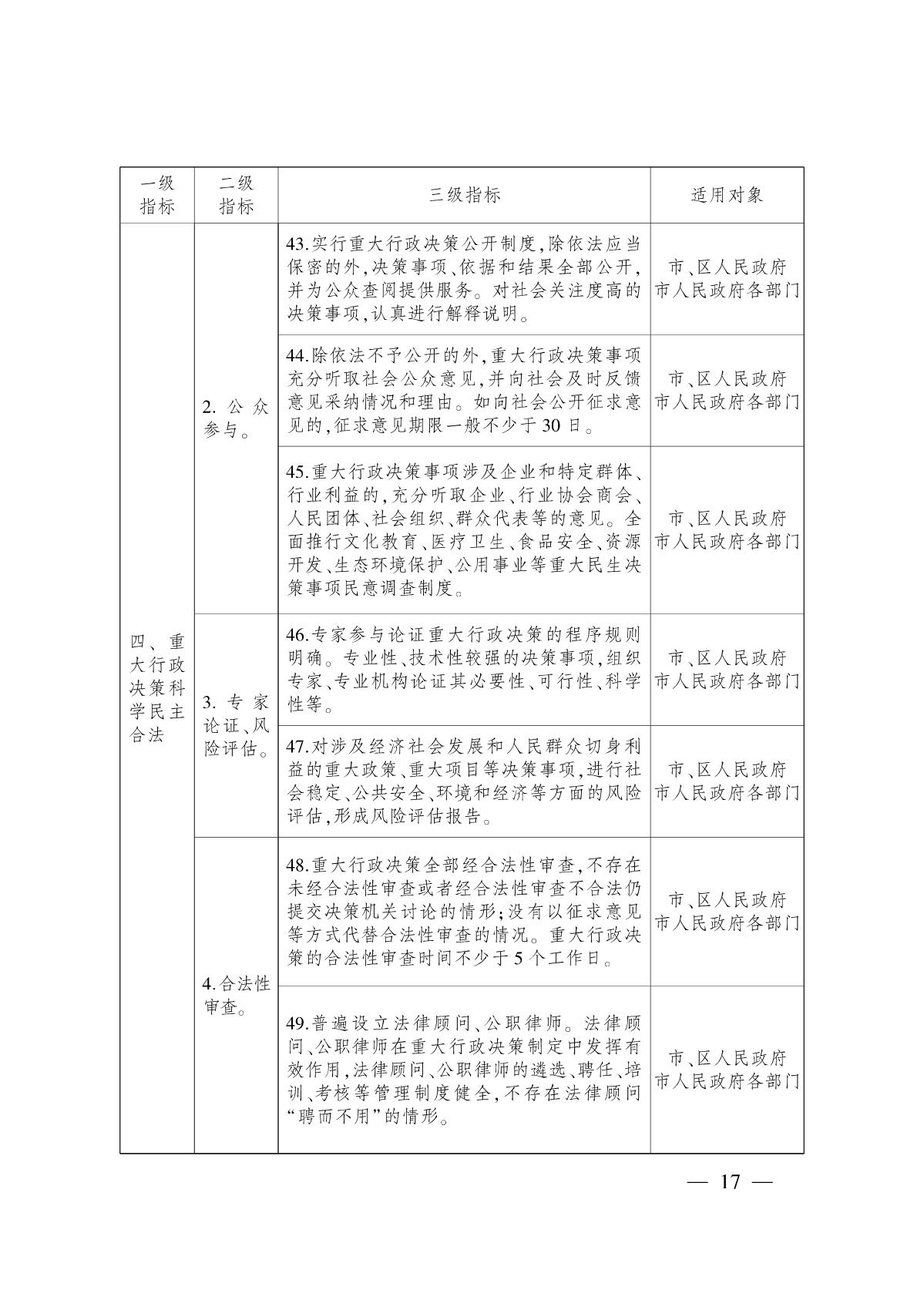 (四)嚴(yán)格履行重大行政決策程序,提高科學(xué)民主依法決策水平。準(zhǔn)確界定重大行政決策事項(xiàng)范圍,實(shí)施重大行政決策事項(xiàng)目錄制管理,嚴(yán)格履行公眾參與、專家論證、風(fēng)險(xiǎn)評(píng)估、合法性審查、集體討論決定等重大行政決策程序,充分發(fā)揮法律顧問、公職律師在重大行政決策中的作用。實(shí)行重大行政決策公開制度,全面推行重大民生決策事項(xiàng)民意調(diào)查制度,建立健全重大行政決策跟蹤反饋和評(píng)估制度,不斷強(qiáng)化決策規(guī)范化建設(shè)。