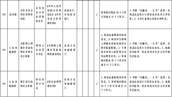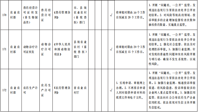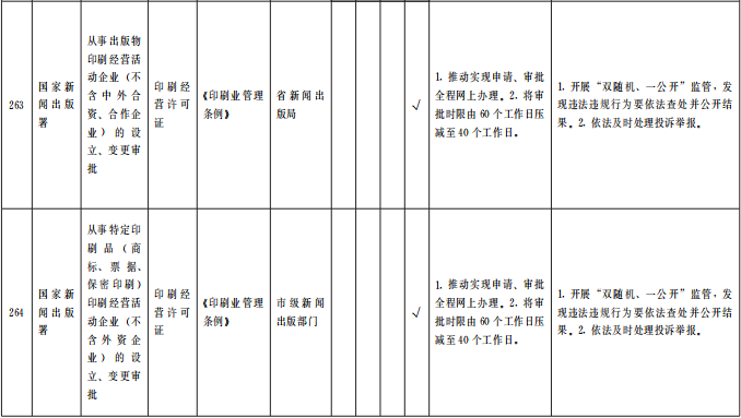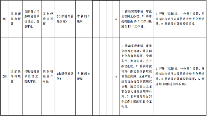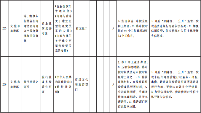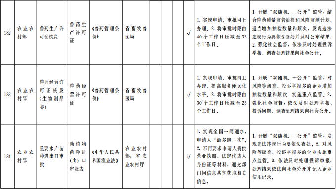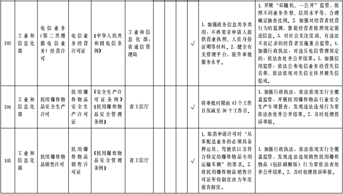 (四)優(yōu)化審批服務(wù)。在全省范圍內(nèi)對(duì)263項(xiàng)(中央事項(xiàng)清單256項(xiàng)、省級(jí)事項(xiàng)清單7項(xiàng))涉企經(jīng)營(yíng)許可事項(xiàng)優(yōu)化審批服務(wù)。各地各部門(mén)要采取切實(shí)措施,按清單要求辦理。對(duì)中央事項(xiàng)清單中調(diào)整審批層級(jí)的事項(xiàng),省直相關(guān)業(yè)務(wù)主管部門(mén)要主動(dòng)加強(qiáng)與國(guó)家有關(guān)部委對(duì)接,做好承接工作,同時(shí)做好對(duì)市縣業(yè)務(wù)指導(dǎo)和審批人員培訓(xùn),確?;鶎咏拥米 ⒐艿煤?。對(duì)精簡(jiǎn)許可條件和審批材料的事項(xiàng),各級(jí)各部門(mén)間要加強(qiáng)信息共享,減輕企業(yè)辦事負(fù)擔(dān)。對(duì)優(yōu)化審批流程的事項(xiàng),要精簡(jiǎn)審批環(huán)節(jié)、壓減審批時(shí)限。對(duì)設(shè)定了許可證件有效期限的事項(xiàng),要取消或延長(zhǎng)許可證件有效期限,方便企業(yè)持續(xù)開(kāi)展經(jīng)營(yíng)。對(duì)設(shè)定了許可數(shù)量限制的事項(xiàng),要取消或合理放寬數(shù)量限制并定期公布總量控制條件、企業(yè)存量、申請(qǐng)排序等情況,鼓勵(lì)企業(yè)有序競(jìng)爭(zhēng)。各地各部門(mén)要持續(xù)回應(yīng)企業(yè)關(guān)切,積極探索進(jìn)一步優(yōu)化審批服務(wù)的創(chuàng)新舉措。(責(zé)任單位:省直有關(guān)部門(mén)、中央在甘有關(guān)單位,各市州政府、蘭州新區(qū)管委會(huì))
