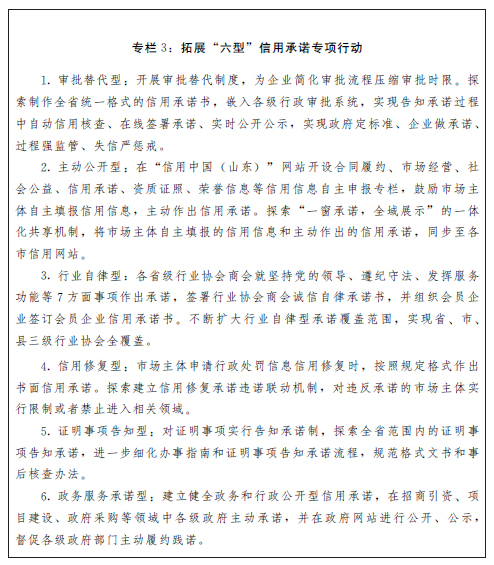 (九)大力弘揚誠信文化,打響“誠信山東”品牌。加大誠信教育和宣傳工作力度,采取正面宣傳與輿論監(jiān)督相結(jié)合的方式,打造不敢失信、不能失信、不愿失信的社會環(huán)境,為全省經(jīng)濟社會發(fā)展提供道德支撐和信用保障。