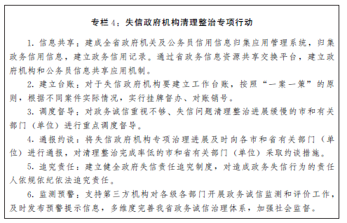 健全政府守信踐諾機制。將守信踐諾情況納入政務(wù)信用記錄,推動各級各部門樹立誠信意識和提高誠信水平。持續(xù)開展失信政府機構(gòu)清理整治專項行動,聚焦“新官不理舊賬”等突出問題,采取有力措施,徹底清理存量,嚴(yán)防發(fā)生增量,對失信政府機構(gòu)“零容忍”。