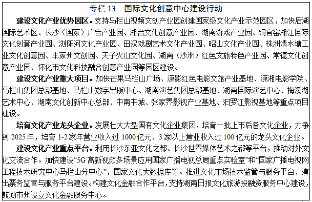 10.文化產(chǎn)業(yè)。遵循“守正創(chuàng)新”發(fā)展理念,挖掘湖湘特色文化,大力發(fā)展數(shù)字文化產(chǎn)業(yè),擴(kuò)大文化產(chǎn)品和服務(wù)供給,打造具有國際影響力的文化創(chuàng)意中心。力爭到2025年,全省規(guī)模以上文化企業(yè)數(shù)量達(dá)到5000家,營業(yè)收入達(dá)到5000億元。鞏固影視傳媒業(yè)優(yōu)勢(shì)地位。全面提升電視劇、綜藝節(jié)目、紀(jì)錄片等傳統(tǒng)節(jié)目質(zhì)量,開發(fā)豎屏節(jié)目、互動(dòng)節(jié)目、沉浸式節(jié)目等新興視頻節(jié)目,做強(qiáng)以湖南衛(wèi)視為主的電視媒體,推動(dòng)“數(shù)字湖南·智慧廣電”建設(shè),加快發(fā)展高新視頻內(nèi)容產(chǎn)業(yè),著力打造馬欄山國家5G高新視頻內(nèi)容產(chǎn)業(yè)核心基地。提升電影制作、發(fā)行、播映和開發(fā)能力。加快新聞出版業(yè)轉(zhuǎn)型發(fā)展。做大做強(qiáng)湘版圖書品牌,推進(jìn)IP全版權(quán)運(yùn)營,提升編、印、發(fā)、供全流程融合化、數(shù)字化、智能化水平,推進(jìn)實(shí)體書店信息化升級(jí)和改造。促進(jìn)演藝娛樂業(yè)提質(zhì)升級(jí)。支持具有湘情湘味的戲曲、民樂、雜技等演藝作品演出,提質(zhì)升級(jí)旅游景點(diǎn)演藝節(jié)目,扶持大型演藝機(jī)構(gòu)建設(shè)文化藝術(shù)經(jīng)營綜合體,深度布局藝術(shù)生產(chǎn)、制作、宣傳、票務(wù)銷售、演出場所等全產(chǎn)業(yè)鏈。鼓勵(lì)動(dòng)漫游戲業(yè)創(chuàng)新發(fā)展。支持湖湘原創(chuàng)漫畫、影視動(dòng)畫、網(wǎng)絡(luò)動(dòng)漫、手機(jī)動(dòng)漫等開發(fā),加快動(dòng)漫游戲、虛擬仿真及衍生產(chǎn)品服務(wù)的拓展應(yīng)用,加強(qiáng)動(dòng)漫游戲關(guān)鍵技術(shù)研發(fā),打造一批動(dòng)漫游戲原創(chuàng)作品。開發(fā)湖湘特色文化資源。深入挖掘紅色文化、湘商文化、書院文化價(jià)值,拓展《湖湘文庫》的利用價(jià)值。保護(hù)傳承少數(shù)民族特色文化,加強(qiáng)對(duì)民間文學(xué)、民俗文化、民間音樂舞蹈戲曲的保護(hù),扶持民族民間文化社團(tuán)組織發(fā)展,打造一批民間文化藝術(shù)之鄉(xiāng)。鼓勵(lì)合理利用文物和非物質(zhì)文化遺產(chǎn)資源進(jìn)行文藝創(chuàng)作和文創(chuàng)設(shè)計(jì),開發(fā)相關(guān)文創(chuàng)產(chǎn)品,重點(diǎn)推進(jìn)湘繡、湘瓷、湘茶、煙花等提質(zhì)升級(jí)。發(fā)展數(shù)字文化產(chǎn)業(yè)。推動(dòng)文化旅游、演藝娛樂、文博會(huì)展、廣播電視等行業(yè)數(shù)字化轉(zhuǎn)型,培育數(shù)字電影、網(wǎng)絡(luò)游戲、數(shù)字音樂、數(shù)字出版、網(wǎng)絡(luò)視聽等新興產(chǎn)業(yè),促進(jìn)網(wǎng)絡(luò)文學(xué)、網(wǎng)絡(luò)音樂、網(wǎng)絡(luò)演出、網(wǎng)絡(luò)自制劇、微電影、短視頻、直播作品等新興文化作品繁榮有序發(fā)展。依托優(yōu)勢(shì)文化產(chǎn)業(yè)園區(qū),建設(shè)一批數(shù)字文化產(chǎn)業(yè)集群。