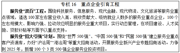 服務(wù)業(yè)“招大引強(qiáng)”計(jì)劃。圍繞“世界500強(qiáng)”、“中國500強(qiáng)”和“民營500強(qiáng)”建立服務(wù)業(yè)重點(diǎn)客戶資源庫,辦好“滬洽周”“港洽周”等重大招商活動(dòng),開展服務(wù)業(yè)新興產(chǎn)業(yè)專題招商活動(dòng)。力爭到2025年,新增100個(gè)3類500強(qiáng)企業(yè)服務(wù)業(yè)投資項(xiàng)目。
