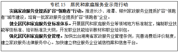 12.居民和家庭服務(wù)。進(jìn)一步完善家政、托育、物業(yè)、社區(qū)等服務(wù)標(biāo)準(zhǔn),提升從業(yè)人員素質(zhì),健全行業(yè)誠信體系,滿足城鎮(zhèn)居民家庭多元化、個(gè)性化、高品質(zhì)的服務(wù)需求。提升家政服務(wù)。發(fā)展母嬰服務(wù)、養(yǎng)老護(hù)理、家庭管理、鐘點(diǎn)廚師等全方位、精細(xì)化服務(wù)。開展家政服務(wù)提質(zhì)擴(kuò)容“領(lǐng)跑者”行動(dòng),培育連鎖家政服務(wù)品牌。大力發(fā)展“互聯(lián)網(wǎng)+家政”, 推動(dòng)居民和家庭服務(wù)等消費(fèi)領(lǐng)域信用體系建設(shè)。完善托育服務(wù)。強(qiáng)化集中托育、育兒指導(dǎo)、養(yǎng)護(hù)培訓(xùn)等服務(wù),建立家庭托育點(diǎn)登記備案制度,研究出臺(tái)家庭托育點(diǎn)管理辦法,支持普惠性嬰幼兒照護(hù)服務(wù)機(jī)構(gòu)發(fā)展,建立集中管理運(yùn)營的社區(qū)托育服務(wù)網(wǎng)絡(luò)。鼓勵(lì)發(fā)展互聯(lián)網(wǎng)直播互動(dòng)式家庭育兒服務(wù),開發(fā)嬰幼兒養(yǎng)育課程、父母課堂等,培育智慧托育新業(yè)態(tài)。規(guī)范物業(yè)服務(wù)。鼓勵(lì)物業(yè)企業(yè)向智慧社區(qū)運(yùn)營商轉(zhuǎn)型,延伸安全、購物、教育、養(yǎng)老等服務(wù)功能。推進(jìn)智慧物業(yè)管理服務(wù)平臺(tái)建設(shè),構(gòu)建物業(yè)管理、政務(wù)服務(wù)、公共服務(wù)和生活服務(wù)一體化平臺(tái),促進(jìn)物業(yè)服務(wù)線上線下融合發(fā)展。完善物業(yè)服務(wù)市場監(jiān)管體系,建立健全物業(yè)管理信息公開公示制度和企業(yè)信用管理制度,優(yōu)化物業(yè)服務(wù)市場競爭環(huán)境。發(fā)展社區(qū)服務(wù)。加快推進(jìn)社區(qū)綜合服務(wù)中心建設(shè),建立提供餐飲零售、家政服務(wù)、美容美發(fā)、洗滌保養(yǎng)、售后維修、養(yǎng)老服務(wù)等生活性服務(wù)的“一站式”社區(qū)服務(wù)體系。提高社區(qū)服務(wù)智能化水平,完善自助服務(wù)設(shè)施布局。
