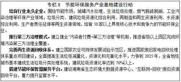 5.節(jié)能環(huán)保服務(wù)。推進(jìn)生態(tài)強(qiáng)省建設(shè),促進(jìn)生產(chǎn)生活方式綠色轉(zhuǎn)型,建設(shè)全國重要的節(jié)能環(huán)保服務(wù)產(chǎn)業(yè)基地。力爭 “十四五”期間,全省節(jié)能環(huán)保服務(wù)業(yè)產(chǎn)值年均增長15%以上。發(fā)展節(jié)能服務(wù)。推動(dòng)發(fā)展合同能源管理,積極推廣節(jié)能咨詢、診斷、設(shè)計(jì)、融資、改造、托管等“一站式”綜合服務(wù)模式,實(shí)施“能效領(lǐng)跑者”制度,持續(xù)推進(jìn)低碳、節(jié)能產(chǎn)品認(rèn)證,推廣低碳、節(jié)能技術(shù)應(yīng)用,開展國家級(jí)節(jié)約型公共機(jī)構(gòu)示范單位創(chuàng)建。壯大環(huán)保服務(wù)。發(fā)展生態(tài)修復(fù)、環(huán)境風(fēng)險(xiǎn)與損害評(píng)價(jià)、排污權(quán)交易、綠色認(rèn)證等環(huán)保服務(wù),探索環(huán)境管家、綠色聯(lián)盟、產(chǎn)業(yè)共生、第三方環(huán)境服務(wù)等新模式,鼓勵(lì)發(fā)展環(huán)保服務(wù)總承包和環(huán)境治理特許經(jīng)營,推進(jìn)小城鎮(zhèn)環(huán)境綜合治理托管服務(wù)國家試點(diǎn)。培育“碳達(dá)峰”“碳中和”衍生服務(wù)。拓展碳資產(chǎn)管理、碳咨詢、碳排放權(quán)交易,完善碳市場管理層級(jí)和能源消費(fèi)雙控制度,積極參與國家碳排放交易市場建設(shè)和氣候投融資試點(diǎn),開展空氣質(zhì)量達(dá)標(biāo)與碳排放達(dá)峰“雙達(dá)”試點(diǎn)示范創(chuàng)建。完善再生資源回收體系。推進(jìn)廢舊家電回收處理體系建設(shè),建立健全廢舊農(nóng)用物資回收利用網(wǎng)絡(luò),建設(shè)線上線下融合的廢舊資源回收和循環(huán)利用平臺(tái)。鼓勵(lì)具備條件的縣市區(qū)實(shí)施生活垃圾強(qiáng)制分類。