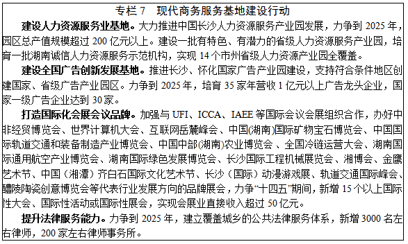 4.商務(wù)服務(wù)。加快推進(jìn)商務(wù)服務(wù)業(yè)品牌化、專業(yè)化、國際化發(fā)展,建設(shè)功能完備、業(yè)態(tài)豐富的現(xiàn)代商務(wù)服務(wù)基地。力爭到2025年,全省商務(wù)服務(wù)業(yè)增加值突破2000億元。提升人力資源服務(wù)供給水平。發(fā)展高級(jí)人才尋訪、人力資源管理咨詢、人力資源軟件開發(fā)、靈活用工等服務(wù),大力推進(jìn)國家人力資源服務(wù)產(chǎn)業(yè)園建設(shè),爭創(chuàng)一批“全國人力資源服務(wù)機(jī)構(gòu)誠信示范單位”。培育會(huì)展服務(wù)品牌。大力發(fā)展數(shù)字會(huì)展,引進(jìn)國際知名會(huì)展品牌,提高現(xiàn)有場館配套設(shè)施的智能化和信息化水平,利用湖南企業(yè)國際化管理服務(wù)平臺(tái),優(yōu)化湖南展會(huì)數(shù)據(jù)庫,規(guī)范展會(huì)信息發(fā)布。完善公共法律服務(wù)體系。提高法律服務(wù)質(zhì)量,發(fā)展涉外法律服務(wù)機(jī)構(gòu),加強(qiáng)法律服務(wù)隊(duì)伍建設(shè),培養(yǎng)一批行業(yè)領(lǐng)軍人才和涉外法律人才,完善職業(yè)行為規(guī)范和誠信評(píng)價(jià)體系。大力推動(dòng)基本公共法律服務(wù)均衡發(fā)展,建設(shè)融合公共法律服務(wù)實(shí)體、網(wǎng)絡(luò)、熱線的平臺(tái)。促進(jìn)廣告產(chǎn)業(yè)轉(zhuǎn)型升級(jí)。推動(dòng)廣告業(yè)數(shù)字化轉(zhuǎn)型,運(yùn)用AR、VR等技術(shù),拓展直播、短視頻等數(shù)字媒體推廣渠道,培育一批國家一級(jí)廣告企業(yè),建設(shè)一批國家、省級(jí)廣告產(chǎn)業(yè)園。完善廣告綜合監(jiān)督體系,加大查處虛假違法廣告。大力發(fā)展專業(yè)咨詢服務(wù)。推動(dòng)會(huì)計(jì)、審計(jì)、資產(chǎn)評(píng)估、信用評(píng)估等行業(yè)發(fā)展,豐富品牌策劃、營銷策劃、財(cái)務(wù)顧問、后勤管理等企業(yè)管理服務(wù)。