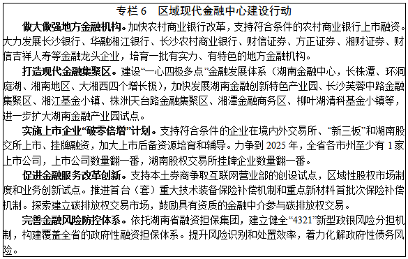 3.現(xiàn)代金融。增強(qiáng)金融服務(wù)實(shí)體經(jīng)濟(jì)能力,推進(jìn)金融產(chǎn)品和服務(wù)創(chuàng)新,建設(shè)多層次資本市場體系,深化金融改革和擴(kuò)大開放,提升金融風(fēng)險(xiǎn)防控能力,建立與“三高四新”戰(zhàn)略相適應(yīng)的現(xiàn)代金融服務(wù)體系,打造區(qū)域現(xiàn)代金融中心。力爭到2025年,全省金融業(yè)增加值占GDP比重達(dá)到6%左右。強(qiáng)化服務(wù)實(shí)體經(jīng)濟(jì)能力。重點(diǎn)發(fā)展數(shù)字普惠金融,提高小微企業(yè)信用貸款占比和制造業(yè)中長期貸款比重。強(qiáng)化科技金融發(fā)展,加大科技信貸投入,鼓勵(lì)開展知識(shí)產(chǎn)權(quán)質(zhì)押融資、科技融資擔(dān)保等業(yè)務(wù)。發(fā)展綠色金融,創(chuàng)建國家綠色金融改革創(chuàng)新試驗(yàn)區(qū),引導(dǎo)金融機(jī)構(gòu)加大對(duì)低碳產(chǎn)業(yè)、清潔能源、節(jié)能環(huán)保等領(lǐng)域信貸投放力度。推進(jìn)“一縣兩行”建設(shè),促進(jìn)金融業(yè)支持鄉(xiāng)村振興。探索創(chuàng)新供應(yīng)鏈金融服務(wù)模式。完善保險(xiǎn)市場,創(chuàng)新發(fā)展科技保險(xiǎn),推廣發(fā)展專利保險(xiǎn)、安全生產(chǎn)責(zé)任險(xiǎn)等,健全農(nóng)業(yè)保險(xiǎn)體系,穩(wěn)步拓展基礎(chǔ)保險(xiǎn)服務(wù)“村村通”試點(diǎn)范圍。建設(shè)多層次資本市場體系。實(shí)施上市企業(yè)“破零倍增”計(jì)劃。爭取湖南股權(quán)交易所納入全國區(qū)域股權(quán)市場試點(diǎn)范圍,發(fā)揮好現(xiàn)有有色金屬、林權(quán)、能源交易等平臺(tái)作用,設(shè)立軍民融合、文化創(chuàng)意等特色板塊。大力發(fā)展私募股權(quán)基金,加快湘江基金小鎮(zhèn)等基金集聚區(qū)建設(shè)。發(fā)展新型金融服務(wù)。支持消費(fèi)金融、產(chǎn)業(yè)基金等新興金融服務(wù)發(fā)展,申請(qǐng)?jiān)O(shè)立期貨交割庫,引導(dǎo)“7+4”類地方金融組織、互聯(lián)網(wǎng)金融平臺(tái)和第三方支付行業(yè)規(guī)范發(fā)展。穩(wěn)步推進(jìn)金融改革開放。促進(jìn)金融業(yè)數(shù)字化轉(zhuǎn)型,積極穩(wěn)妥推進(jìn)長沙數(shù)字人民幣試點(diǎn)工作,適時(shí)將數(shù)字人民幣試點(diǎn)工作向全省推廣。創(chuàng)新中國(湖南)自由貿(mào)易試驗(yàn)區(qū)金融服務(wù),引進(jìn)國際優(yōu)質(zhì)金融資源,拓展地方金融機(jī)構(gòu)境外融資業(yè)務(wù)和企業(yè)境外融資渠道。防范化解地方金融風(fēng)險(xiǎn)。加強(qiáng)地方金融信用體系建設(shè),建立健全全省地方金融風(fēng)險(xiǎn)監(jiān)測預(yù)警平臺(tái)和中小企業(yè)信用信息服務(wù)平臺(tái),推動(dòng)地方金融信用信息共享應(yīng)用和金融風(fēng)險(xiǎn)防控全覆蓋。