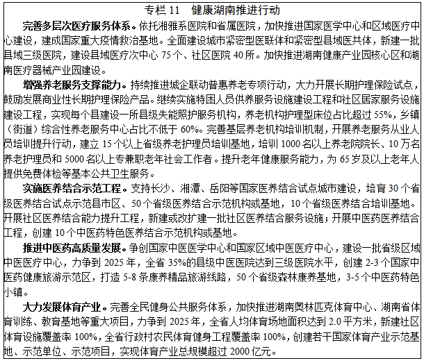 8.康養(yǎng)服務(wù)。深入實(shí)施“健康湖南行動(dòng)”,滿足城鄉(xiāng)居民多樣化、差異化、個(gè)性化的健康養(yǎng)老服務(wù)需求。力爭到2025年,基本建成服務(wù)全生命周期、結(jié)構(gòu)合理、功能完善的健康服務(wù)體系,及覆蓋城鄉(xiāng)、分布均衡、惠及全民的養(yǎng)老服務(wù)體系。發(fā)展醫(yī)療健康服務(wù)。加快推進(jìn)國家醫(yī)學(xué)中心和國家區(qū)域醫(yī)療中心建設(shè),統(tǒng)籌推進(jìn)省級(jí)區(qū)域醫(yī)療中心和優(yōu)質(zhì)醫(yī)療資源擴(kuò)容下沉項(xiàng)目建設(shè),完善農(nóng)村三級(jí)衛(wèi)生服務(wù)網(wǎng)絡(luò)和城市社區(qū)衛(wèi)生機(jī)構(gòu),推進(jìn)標(biāo)準(zhǔn)化鄉(xiāng)鎮(zhèn)衛(wèi)生院建設(shè)和村衛(wèi)生室改造。引導(dǎo)社會(huì)辦醫(yī)差異化發(fā)展,鼓勵(lì)社會(huì)力量舉辦非營利性醫(yī)療機(jī)構(gòu)。完善家庭醫(yī)生簽約服務(wù)。發(fā)展“智慧醫(yī)院”,建設(shè)健康醫(yī)療大數(shù)據(jù)中心,大力推廣“遠(yuǎn)程醫(yī)療”服務(wù),探索推進(jìn)可穿戴設(shè)備、智能健康電子產(chǎn)品和健康醫(yī)療移動(dòng)應(yīng)用。完善提升養(yǎng)老服務(wù)。支持發(fā)展普惠型養(yǎng)老服務(wù),推動(dòng)養(yǎng)老機(jī)構(gòu)規(guī)?;?、連鎖化、品牌化發(fā)展,支持國有企業(yè)參與發(fā)展養(yǎng)老服務(wù),引導(dǎo)社會(huì)資本投資,培育一批龍頭企業(yè)、新型養(yǎng)老產(chǎn)業(yè)集團(tuán),推動(dòng)培訓(xùn)療養(yǎng)資源轉(zhuǎn)型發(fā)展養(yǎng)老服務(wù)。完善養(yǎng)老服務(wù)設(shè)施,推進(jìn)老舊小區(qū)適老化改造,補(bǔ)齊農(nóng)村養(yǎng)老服務(wù)設(shè)施短板。發(fā)展社區(qū)居家養(yǎng)老服務(wù),促進(jìn)街道綜合養(yǎng)老服務(wù)中心和帶護(hù)理床位的城市社區(qū)日間照料中心全覆蓋。實(shí)施醫(yī)養(yǎng)結(jié)合示范工程和社區(qū)醫(yī)養(yǎng)結(jié)合能力提升工程,培育一批醫(yī)養(yǎng)結(jié)合示范機(jī)構(gòu)和醫(yī)養(yǎng)結(jié)合試點(diǎn)示范區(qū),積極推進(jìn)智慧健康養(yǎng)老應(yīng)用試點(diǎn)示范。完善包括健康教育、預(yù)防保健、疾病診治、康復(fù)護(hù)理、長期照護(hù)、安寧療護(hù)的綜合連續(xù)、覆蓋城鄉(xiāng)的老年健康服務(wù)體系。傳承創(chuàng)新中醫(yī)藥保健服務(wù)。健全覆蓋城鄉(xiāng)的中醫(yī)醫(yī)療保健服務(wù)體系,實(shí)施湖南省中醫(yī)治未病健康惠民工程和中醫(yī)康復(fù)服務(wù)工程。創(chuàng)建國家中醫(yī)藥綜合改革示范區(qū),建立中藥材大數(shù)據(jù)服務(wù)平臺(tái),新建一批中醫(yī)藥文化地標(biāo),研發(fā)推廣藥膳、藥飲、藥妝、藥浴等中醫(yī)藥保健產(chǎn)品,打造湖湘中醫(yī)藥服務(wù)品牌。發(fā)展體育健身服務(wù)。推進(jìn)職業(yè)體育發(fā)展,促進(jìn)體育項(xiàng)目協(xié)會(huì)改革和體育場館資源所有權(quán)、經(jīng)營權(quán)分離改革,引導(dǎo)社會(huì)力量投資建設(shè)、運(yùn)營體育場所和設(shè)施。培育職業(yè)體育品牌賽事。發(fā)展運(yùn)動(dòng)員經(jīng)紀(jì)、賽事組織、體育信息咨詢等中介服務(wù),擴(kuò)大體育健身市場供給。加強(qiáng)公共體育服務(wù)體系建設(shè),構(gòu)建縣鄉(xiāng)村三級(jí)全民健身設(shè)施網(wǎng)絡(luò)和城市社區(qū)15分鐘健身圈。推進(jìn)“江、湖、山、道”全民健身品牌活動(dòng)和“一縣一品”特色體育項(xiàng)目,打造具有區(qū)域特色的健身示范基地和產(chǎn)業(yè)帶。培育多樣化康養(yǎng)服務(wù)。發(fā)展森林康養(yǎng)、中醫(yī)藥健康旅游、體育醫(yī)療康復(fù)等,建設(shè)一批高水平森林康養(yǎng)基地,健康醫(yī)療旅游示范區(qū)。