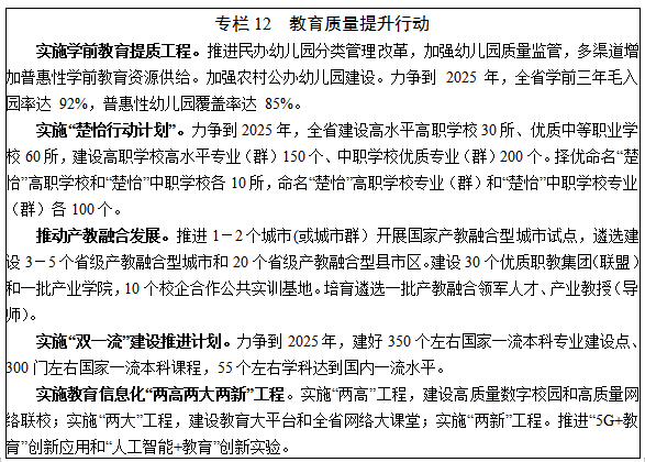 9.教育培訓(xùn)。統(tǒng)籌公辦教育和民辦教育發(fā)展,建立覆蓋全員、全過程、全方位的育人體系。普及學(xué)前教育。實(shí)施學(xué)前教育提質(zhì)工程,大力發(fā)展普惠性學(xué)前教育,構(gòu)建覆蓋城鄉(xiāng)、布局合理、公益普惠的學(xué)前教育公共服務(wù)體系。健全職業(yè)教育。推進(jìn)部省共建職業(yè)教育改革發(fā)展高地工程,大力實(shí)施“楚怡行動(dòng)計(jì)劃”,促進(jìn)產(chǎn)教融合發(fā)展。推動(dòng)中職教育特色發(fā)展,提升高等職業(yè)教育發(fā)展水平,積極穩(wěn)妥開展本科層次職業(yè)教育試點(diǎn)。完善終身教育。推動(dòng)終身教育創(chuàng)新規(guī)范發(fā)展,建立全民終身學(xué)習(xí)推進(jìn)機(jī)制,發(fā)揮在線教育優(yōu)勢(shì),完善終身學(xué)習(xí)體系,建設(shè)學(xué)習(xí)型社會(huì)。推進(jìn)湖南開放大學(xué)建設(shè)。擴(kuò)大老年教育資源供給,搭建老年教育資源共享和公共服務(wù)平臺(tái)。提質(zhì)高等教育。實(shí)施“雙一流”建設(shè)推進(jìn)計(jì)劃,著力培養(yǎng)世界一流和國內(nèi)一流學(xué)校與學(xué)科。高質(zhì)量發(fā)展研究生教育,大力優(yōu)化培養(yǎng)類型結(jié)構(gòu)。支持高校引進(jìn)國(境)外優(yōu)質(zhì)資源,開展高水平高質(zhì)量合作辦學(xué),做強(qiáng)“留學(xué)湖南”品牌。發(fā)展智慧教育。以“國家教育信息化 2.0 試點(diǎn)省”為抓手,加快推進(jìn)新型基礎(chǔ)網(wǎng)絡(luò)、數(shù)字校園、學(xué)習(xí)終端等建設(shè),打造一批教育信息化融合應(yīng)用實(shí)驗(yàn)區(qū)和教育信息化創(chuàng)新試點(diǎn)學(xué)校,探索5G和人工智能等條件下的教育新形態(tài)。