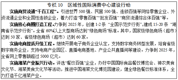 7.現(xiàn)代商貿(mào)。圍繞打造國內(nèi)大循環(huán)和國內(nèi)國際雙循環(huán)重要節(jié)點(diǎn),積極營造放心消費(fèi)環(huán)境,促進(jìn)消費(fèi)新業(yè)態(tài)、新模式、新場景的普及應(yīng)用,打造區(qū)域性國際消費(fèi)中心。力爭“十四五”期間,全省社會(huì)消費(fèi)品零售總額年均增長7%左右。推動(dòng)零售業(yè)轉(zhuǎn)型升級(jí)。加快便利店品牌化、連鎖化、智能化發(fā)展,開展“湖南省示范步行街”創(chuàng)建,建設(shè)一批現(xiàn)代商業(yè)綜合體、一站式大型購物中心、大型品牌折扣店等。促進(jìn)新零售發(fā)展,拓展無接觸、少接觸消費(fèi)模式,大力發(fā)展智慧超市、智慧商店等。支持長沙創(chuàng)建區(qū)域性國際消費(fèi)中心城市。完善批發(fā)市場體系。圍繞有色金屬、工程機(jī)械、特色農(nóng)產(chǎn)品等優(yōu)勢(shì)產(chǎn)業(yè),打造輻射中西部、影響全國的區(qū)域批發(fā)市場。鼓勵(lì)商貿(mào)市場跨行業(yè)、跨領(lǐng)域融合發(fā)展,增強(qiáng)信息、交易、加工、配送、融資、擔(dān)保等一體化綜合服務(wù)能力。促進(jìn)住宿業(yè)提檔升級(jí)。培養(yǎng)閑暇經(jīng)濟(jì)和度假文化,引進(jìn)國內(nèi)外高端酒店品牌和管理公司,提升住宿業(yè)標(biāo)準(zhǔn)水平。發(fā)展具有湖湘文化、民族地域特色的民宿酒店,促進(jìn)經(jīng)濟(jì)型酒店品牌化、連鎖化、集團(tuán)化發(fā)展。做大做強(qiáng)餐飲業(yè)。推進(jìn)餐飲業(yè)連鎖化經(jīng)營,發(fā)展中央廚房,拓展在線訂餐、美食鑒賞、顧客點(diǎn)評(píng)等服務(wù)功能。實(shí)施湘菜產(chǎn)業(yè)振興行動(dòng),開發(fā)新派湘菜,傳承湘菜名品,打造具有湖南特色的地方名店、名菜、名小吃等美食名片,推動(dòng)湘菜出湘。促進(jìn)電商創(chuàng)新發(fā)展。加快發(fā)展跨境電商、農(nóng)村電商、社區(qū)電商、工業(yè)電商、生鮮電商、直播電商等新模式。完善農(nóng)村電商服務(wù)體系,開展“數(shù)商興農(nóng)”行動(dòng),壯大網(wǎng)銷“一縣一品”品牌,持續(xù)推動(dòng)農(nóng)產(chǎn)品上行,提升農(nóng)村電商與快遞物流協(xié)同發(fā)展水平。全面推進(jìn)長沙、湘潭、岳陽、郴州等跨境電子商務(wù)綜合試驗(yàn)區(qū)建設(shè)。推動(dòng)電子商務(wù)領(lǐng)域信用記錄共建共享,完善市場化信用評(píng)價(jià)體系。擴(kuò)大特色消費(fèi)市場。促進(jìn) “銀發(fā)經(jīng)濟(jì)”“她經(jīng)濟(jì)”“童經(jīng)濟(jì)”“夜經(jīng)濟(jì)”發(fā)展,打造老人、女性、兒童友好的消費(fèi)空間,充分挖掘夜間觀光、娛樂、餐飲資源,重點(diǎn)打造“長沙夜星城”全國品牌,培育特色精品的夜間消費(fèi)功能區(qū)和示范區(qū)。