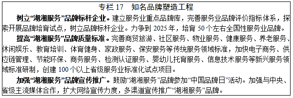 ——堅(jiān)持品質(zhì)發(fā)展。推動(dòng)服務(wù)業(yè)產(chǎn)業(yè)鏈和價(jià)值鏈向高端攀升,推進(jìn)品牌建設(shè),完善服務(wù)質(zhì)量治理體系,提升服務(wù)業(yè)標(biāo)準(zhǔn)化水平,增強(qiáng)“湖湘服務(wù)”品牌影響力和競爭力。以服務(wù)品質(zhì)提升為導(dǎo)向,擴(kuò)大服務(wù)有效供給,大力發(fā)展綠色、健康、優(yōu)質(zhì)的服務(wù)消費(fèi)。
