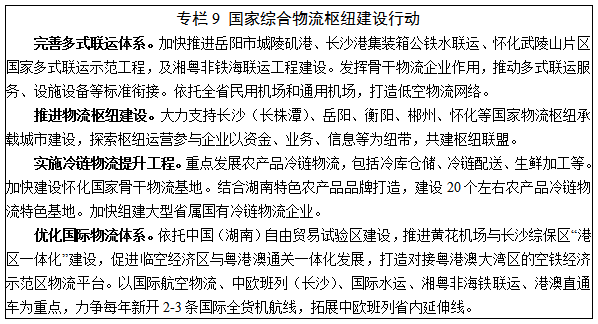6.現(xiàn)代物流。依托“三縱五橫”骨干交通網(wǎng)絡(luò),著力構(gòu)建“通道+樞紐+網(wǎng)絡(luò)+平臺(tái)”的物流體系,打造國家綜合物流樞紐。力爭到2025年,社會(huì)物流總費(fèi)用占GDP比率下降2個(gè)百分點(diǎn)左右。推進(jìn)多式聯(lián)運(yùn)發(fā)展。加快港口、鐵路、公路、機(jī)場等多式聯(lián)運(yùn)物流基礎(chǔ)設(shè)施建設(shè),打通公鐵水空聯(lián)運(yùn)銜接“最后一公里”,實(shí)現(xiàn)企業(yè)間業(yè)務(wù)單證“一單制”。增強(qiáng)國際物流服務(wù)功能,構(gòu)建“四小時(shí)航空經(jīng)濟(jì)圈”,優(yōu)化中歐班列網(wǎng)點(diǎn)布局,推進(jìn)東盟班列常態(tài)化運(yùn)營,加密“五定班輪”班次,推動(dòng)區(qū)域性保稅物流中心和國際快件中心建設(shè)。完善冷鏈物流系統(tǒng)。優(yōu)化冷鏈設(shè)施建設(shè)布局,依托農(nóng)副產(chǎn)品批發(fā)市場、冷鏈產(chǎn)品生產(chǎn)加工龍頭企業(yè)和大型連鎖超市等,大力推進(jìn)國家骨干物流基地建設(shè),打造生產(chǎn)、加工、儲(chǔ)存、運(yùn)輸?shù)冗^程一體化冷鏈物流配送網(wǎng)絡(luò)體系。促進(jìn)物流智能終端設(shè)施建設(shè)和資源共享,推廣農(nóng)產(chǎn)品“生鮮電子商務(wù)+冷鏈宅配”“中央廚房+食材冷鏈配送”等新模式。健全城鄉(xiāng)物流配送網(wǎng)絡(luò)。實(shí)施城鄉(xiāng)物流高效配送專項(xiàng)行動(dòng)和“快遞進(jìn)村”工程,完善縣鄉(xiāng)村三級(jí)物流配送網(wǎng)絡(luò),推動(dòng)農(nóng)村客運(yùn)與物流融合發(fā)展,補(bǔ)齊村級(jí)網(wǎng)絡(luò)短板,實(shí)現(xiàn)全省縣級(jí)物流配送中心和村級(jí)寄遞物流配送站全覆蓋。發(fā)展供應(yīng)鏈物流。實(shí)施數(shù)字化供應(yīng)鏈工程,建設(shè)供應(yīng)鏈數(shù)據(jù)資產(chǎn)交易中心,推進(jìn)全省物流信息互聯(lián)互通,創(chuàng)建全國供應(yīng)鏈創(chuàng)新與應(yīng)用示范城市、示范企業(yè)。大力發(fā)展網(wǎng)絡(luò)貨運(yùn)。推進(jìn)標(biāo)準(zhǔn)化托盤、周轉(zhuǎn)箱循環(huán)共用體系建設(shè),實(shí)施貨物包裝和物流器具綠色化、減量化。加快建立應(yīng)急物流協(xié)同體系,建設(shè)一批應(yīng)急物流重點(diǎn)設(shè)施基地。