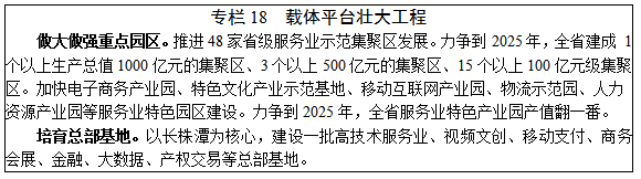打造長株潭高端服務(wù)業(yè)核心區(qū)。強(qiáng)化長沙省會(huì)城市輻射帶動(dòng)功能,圍繞文化創(chuàng)意、科技服務(wù)、信息服務(wù)、現(xiàn)代金融、現(xiàn)代物流、商務(wù)服務(wù)等重點(diǎn)領(lǐng)域,加快推進(jìn)湘江新區(qū)、臨空經(jīng)濟(jì)示范區(qū)、中國(湖南)自由貿(mào)易試驗(yàn)區(qū)、國家綜合物流交通樞紐、馬欄山視頻文創(chuàng)產(chǎn)業(yè)園、岳麓山大學(xué)科技城等建設(shè),打造中部一流、國內(nèi)領(lǐng)先、國際知名的現(xiàn)代服務(wù)業(yè)中心城市。聚焦株洲·中國動(dòng)力谷建設(shè),推進(jìn)株洲科技服務(wù)、信息服務(wù)、教育培訓(xùn)等發(fā)展,打造具有核心競爭力和全國影響力的創(chuàng)新型城市。圍繞建設(shè)湘潭智谷,著力提升科技服務(wù)、信息服務(wù)能力,建設(shè)中部創(chuàng)新發(fā)展示范區(qū)。推動(dòng)湘潭大力發(fā)展紅色旅游、商貿(mào)物流、健康養(yǎng)老等特色服務(wù)業(yè),打造具有國際影響力的紅色旅游目的地。推動(dòng)婁底制造服務(wù)業(yè)發(fā)展,建設(shè)長株潭現(xiàn)代物流服務(wù)區(qū)。