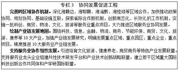 加強(qiáng)服務(wù)業(yè)跨區(qū)域協(xié)作。以中部崛起戰(zhàn)略為契機(jī),加強(qiáng)對(duì)接長江經(jīng)濟(jì)帶、粵港澳大灣區(qū)、西部陸海新通道等國家區(qū)域戰(zhàn)略,強(qiáng)化與周邊省、城市群、城市間不同層級(jí)跨區(qū)域協(xié)同合作。加快推進(jìn)湘贛邊區(qū)域開放合作示范區(qū)建設(shè),深化湘鄂贛協(xié)同發(fā)展,大力推進(jìn)中部地區(qū)省際間基礎(chǔ)設(shè)施互通、產(chǎn)業(yè)協(xié)同發(fā)展、生態(tài)環(huán)境共保聯(lián)治等,促進(jìn)中部地區(qū)加快崛起。大力推進(jìn)長株潭都市圈建設(shè),密切與武漢都市圈、昌九都市圈、成渝地區(qū)雙城經(jīng)濟(jì)圈的深入鏈接,促進(jìn)商貿(mào)物流、文化旅游、科技信息等方面合作,建設(shè)長江上中下游服務(wù)業(yè)密切合作經(jīng)濟(jì)帶。加強(qiáng)與粵港澳大灣區(qū)的深度合作,深入推進(jìn)泛珠三角區(qū)域合作機(jī)制,積極對(duì)接廣深港澳科技走廊,促進(jìn)旅游休閑康養(yǎng)聯(lián)動(dòng),建設(shè)京廣線戰(zhàn)略新興產(chǎn)業(yè)承接帶。加強(qiáng)湘西地區(qū)與西部省份的交流協(xié)作,推進(jìn)湘渝黔文化旅游、醫(yī)療康養(yǎng)、商貿(mào)流通等領(lǐng)域合作,建設(shè)湘渝黔邊城協(xié)作發(fā)展合作區(qū)。深化與北部灣地區(qū)在東盟國家物流產(chǎn)業(yè)園、多式聯(lián)運(yùn)、國際中轉(zhuǎn)運(yùn)輸?shù)群献鳎龠M(jìn)湘桂瓊商貿(mào)合作。
