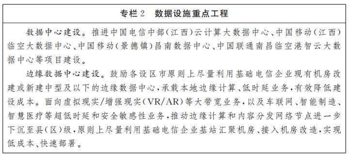 圍繞網(wǎng)絡(luò)設(shè)施、數(shù)據(jù)設(shè)施、智能設(shè)施、創(chuàng)新設(shè)施,強(qiáng)化重大項目的牽引與帶動作用,積極布局?jǐn)?shù)據(jù)中心、國家級互聯(lián)網(wǎng)骨干直聯(lián)點、國際互聯(lián)網(wǎng)數(shù)據(jù)專用通道、工業(yè)互聯(lián)網(wǎng)標(biāo)識解析二級節(jié)點以及AI、區(qū)塊鏈、物聯(lián)網(wǎng)、VR規(guī)模應(yīng)用等一批重大項目,完善全省科創(chuàng)城布局,打造中部地區(qū)領(lǐng)先的新型基礎(chǔ)設(shè)施體系,筑牢數(shù)字江西建設(shè)底座。