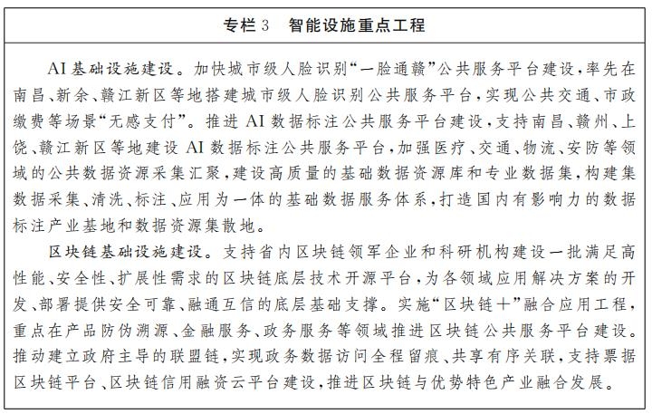 新技術(shù)平臺:推動智能設(shè)施規(guī)模級平臺和應(yīng)用場景建設(shè),充分發(fā)揮南昌“頭雁”作用,前瞻性部署一批AI、區(qū)塊鏈、VR、物聯(lián)網(wǎng)等城市級及以上平臺,鼓勵各設(shè)區(qū)市結(jié)合本地智慧城市建設(shè)、特色產(chǎn)業(yè)發(fā)展需求,按需推進(jìn)AI、物聯(lián)網(wǎng)、區(qū)塊鏈等平臺設(shè)施建設(shè)。