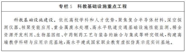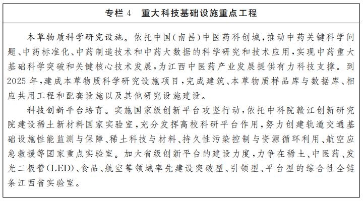 布局大科學(xué)裝置。立足江西資源稟賦和特色產(chǎn)業(yè),以前瞻性、戰(zhàn)略性、整體性眼光,聚焦生物醫(yī)藥、新材料、發(fā)酵工程、航空、射電望遠(yuǎn)鏡等領(lǐng)域,積極爭取國家支持,謀劃建設(shè)國家重大科技基礎(chǔ)設(shè)施。重點以中醫(yī)藥科創(chuàng)城為載體,加快推進(jìn)本草物質(zhì)科學(xué)研究設(shè)施項目建設(shè)。