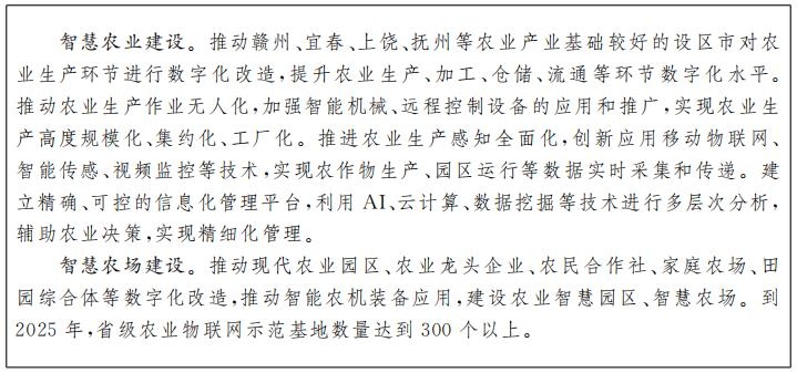 智慧農(nóng)業(yè)基礎(chǔ)設(shè)施建設(shè)。健全農(nóng)業(yè)農(nóng)村信息系統(tǒng),搭建農(nóng)業(yè)產(chǎn)業(yè)鏈大數(shù)據(jù)公共服務(wù)平臺,加快全省農(nóng)業(yè)農(nóng)村數(shù)據(jù)向省農(nóng)業(yè)農(nóng)村云大數(shù)據(jù)中心匯集,全面提升涉農(nóng)數(shù)據(jù)采集、監(jiān)測、分析、決策支撐能力。建立重大建設(shè)項目占用永久基本農(nóng)田補(bǔ)劃情況及永久基本農(nóng)田儲備區(qū)數(shù)據(jù)庫。加快農(nóng)業(yè)生產(chǎn)環(huán)節(jié)數(shù)字化改造,推進(jìn)智慧農(nóng)場、智慧牧場、智慧漁場建設(shè),實施農(nóng)業(yè)物聯(lián)網(wǎng)示范工程,加快5G、物聯(lián)網(wǎng)、AI等技術(shù)以及無人機(jī)、農(nóng)業(yè)機(jī)器人等在種植業(yè)、畜牧業(yè)、漁業(yè)領(lǐng)域應(yīng)用推廣,實現(xiàn)農(nóng)業(yè)生產(chǎn)全面感知化、無人作業(yè)化、管理精細(xì)化,助力鄉(xiāng)村振興戰(zhàn)略實施。推進(jìn)中醫(yī)藥種植養(yǎng)殖數(shù)字化、智能化發(fā)展,打造一批全國領(lǐng)先的智慧種養(yǎng)基地,助力國家中醫(yī)藥綜合改革示范區(qū)和中醫(yī)藥強(qiáng)省建設(shè)。利用大數(shù)據(jù)技術(shù)對農(nóng)產(chǎn)品進(jìn)行全生命周期閉環(huán)管理,加快全省農(nóng)業(yè)投入品電子追溯和農(nóng)副產(chǎn)品質(zhì)量安全追溯平臺建設(shè),創(chuàng)新農(nóng)產(chǎn)品產(chǎn)銷銜接服務(wù)模式,推動農(nóng)產(chǎn)品從田間到餐桌無縫銜接。
