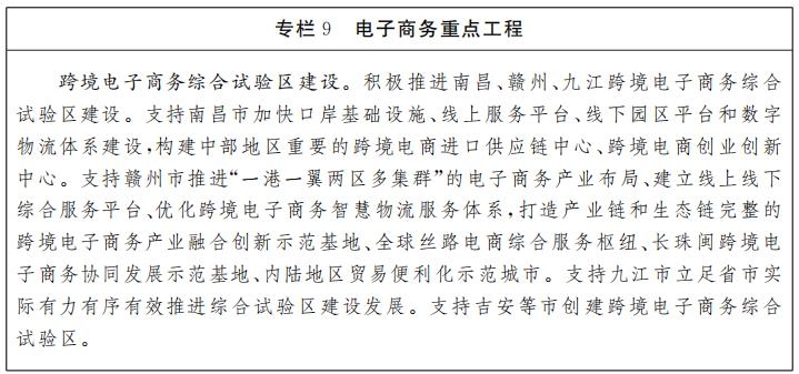 電子商務(wù)平臺建設(shè)。提升電子商務(wù)面向工業(yè)和農(nóng)業(yè)的服務(wù)能力。推進(jìn)重點產(chǎn)業(yè)與電子商務(wù)深度融合,加快工業(yè)電子商務(wù)平臺普及應(yīng)用,支持重點行業(yè)領(lǐng)軍企業(yè)建設(shè)一批專業(yè)性、特色化工業(yè)電子商務(wù)平臺,加強(qiáng)電子商務(wù)平臺與工業(yè)生產(chǎn)數(shù)據(jù)對接。探索以產(chǎn)業(yè)融合為主要特色的內(nèi)陸地區(qū)跨境電子商務(wù)發(fā)展新模式,推進(jìn)跨境電子商務(wù)綜合試驗區(qū)建設(shè),加快構(gòu)建跨境電子商務(wù)綜合服務(wù)平臺。深入推進(jìn)電子商務(wù)平臺向農(nóng)村延伸,實施“互聯(lián)網(wǎng)+”農(nóng)產(chǎn)品出村進(jìn)城工程,助力江西茶葉、贛南臍橙、南豐蜜楠、鄱陽湖水產(chǎn)、高山油茶等名優(yōu)特色農(nóng)產(chǎn)品出村進(jìn)城,推進(jìn)電子商務(wù)平臺與物流配送設(shè)施協(xié)同部署。實施“贛品網(wǎng)上行”,打造一批特色電商小鎮(zhèn)(村)、淘寶村(鎮(zhèn)),鼓勵有序發(fā)展農(nóng)村電商直播和基地直采等新模式,多方拓寬農(nóng)產(chǎn)品銷售渠道。支持發(fā)展平臺經(jīng)濟(jì)、網(wǎng)紅經(jīng)濟(jì)、直播經(jīng)濟(jì)、社交電商等電子商務(wù)新業(yè)態(tài),培育一批數(shù)字商務(wù)企業(yè)。