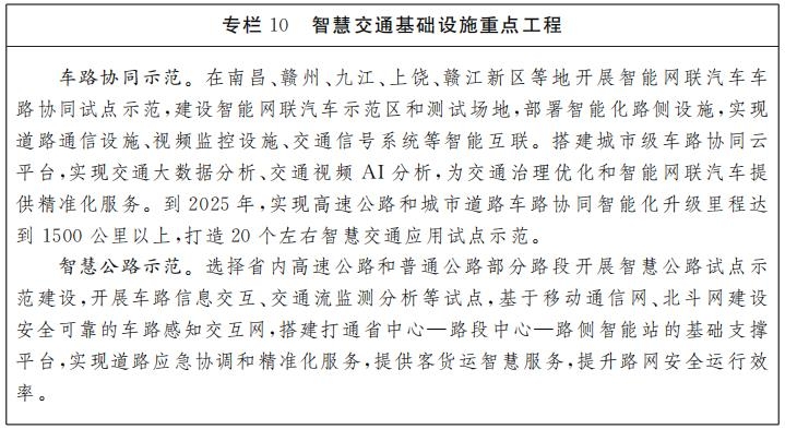 智慧交通基礎(chǔ)設(shè)施建設(shè)。推動全省交通大數(shù)據(jù)中心建設(shè),整合公路、鐵路、水路、民航等各類交通數(shù)據(jù),探索建設(shè)多式聯(lián)運(yùn)綜合運(yùn)輸服務(wù)平臺體系。支持各設(shè)區(qū)市建設(shè)城市交通大腦,強(qiáng)化交通大數(shù)據(jù)分析、交通視頻AI分析等能力,建設(shè)標(biāo)準(zhǔn)統(tǒng)一、開放共享的智能網(wǎng)聯(lián)汽車大數(shù)據(jù)基礎(chǔ)平臺。推進(jìn)智慧道路基礎(chǔ)設(shè)施建設(shè),加強(qiáng)車用無線通信網(wǎng)絡(luò)(LTE-V2X)覆蓋,推進(jìn)新一代車用無線通信網(wǎng)絡(luò)(5G-V2X)在部分城市道路、高速公路重點路段試點示范。分區(qū)域開展景區(qū)、園區(qū)、港口等重點區(qū)域城市道路設(shè)施智能化改造,統(tǒng)籌部署高清攝像頭、激光雷達(dá)、毫米波雷達(dá)、智能交通信號燈、基于蜂窩車聯(lián)網(wǎng)(C-V2X)的路側(cè)單元等智能設(shè)備。在南昌、贛州、九江、上饒、贛江新區(qū)等地建設(shè)自動駕駛測試道路場景,高標(biāo)準(zhǔn)建設(shè)昌九高速智慧高速公路試點項目,打造江西智慧高速公路標(biāo)桿和國內(nèi)綜合性智能駕駛創(chuàng)新示范樣板。支持已有軌道交通的設(shè)區(qū)市建設(shè)地鐵大數(shù)據(jù)平臺,加快基于人臉識別技術(shù)的智慧安檢設(shè)施建設(shè),探索開展基于5G網(wǎng)絡(luò)的軌道交通車載視頻和監(jiān)測數(shù)據(jù)回傳應(yīng)用。推進(jìn)南昌昌北國際機(jī)場等設(shè)施智能化升級,完善高清視頻監(jiān)控、AR智能眼鏡等智能設(shè)施部署。加快內(nèi)河水運(yùn)數(shù)字化改造,提升港口集裝箱裝卸、理貨等智能化水平。