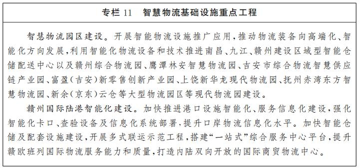 智慧物流基礎(chǔ)設(shè)施建設(shè)。加快全省物流大數(shù)據(jù)中心、省交通運(yùn)輸物流綜合公共信息平臺建設(shè),促進(jìn)物流與鐵路、民航、海關(guān)、商務(wù)等部門數(shù)據(jù)交換共享,實現(xiàn)全省物流信息化率達(dá)到90%以上。加快萬佶、天合、四順等智慧物流服務(wù)平臺建設(shè),支持萬佶物流構(gòu)建國家物流大數(shù)據(jù)中心。推動省級物流公共信息平臺與大型物流企業(yè)數(shù)據(jù)互聯(lián)互通,整合分散的社會物流資源,構(gòu)建縣鄉(xiāng)村三級智慧物流網(wǎng)絡(luò)。鼓勵城鄉(xiāng)配送、冷鏈物流、藥品物流等大數(shù)據(jù)平臺發(fā)展。推動省內(nèi)物流園區(qū)與國家骨干物流園區(qū)“互聯(lián)互通”工程對接,促進(jìn)物流資源協(xié)同、交易撮合。加快物流設(shè)施智能化改造,加強(qiáng)AGV、無人機(jī)、巡檢機(jī)器人、分揀機(jī)器人等智能設(shè)備在物流園區(qū)和大型倉儲中心應(yīng)用推廣。推動京東南昌亞洲一號、蘇寧易購電商物流中心等開展基于“信息系統(tǒng)+貨架+托盤+叉車”的智能倉儲設(shè)施建設(shè)。推進(jìn)口岸設(shè)施和倉儲設(shè)施智能化改造,推動九江港“5G+智慧港口”、贛州國際智慧陸港建設(shè)。加快快遞智能分揀設(shè)施建設(shè),支持南昌、贛州、鷹潭、吉安、上饒等地建設(shè)快遞智能分揀中心。拓展智能末端配送設(shè)施覆蓋范圍,加快智能取件箱布局,實現(xiàn)城市住宅小區(qū)無接觸智能快件箱覆蓋率達(dá)90%。