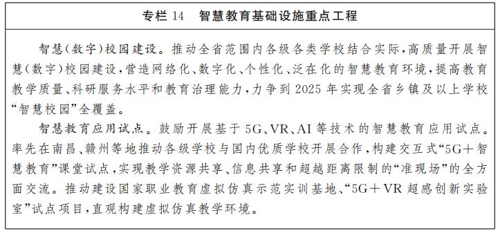 智慧教育基礎(chǔ)設(shè)施建設(shè)。優(yōu)化升級學(xué)校網(wǎng)絡(luò)接入和帶寬條件,推動5G網(wǎng)絡(luò)校園覆蓋。推進(jìn)各級各類學(xué)校智慧校園建設(shè),充分利用“5G+VR”等技術(shù)建設(shè)智慧教室、智慧實驗室、全息課堂等具有實踐性和互動性的學(xué)科教室,加快建設(shè)在線智能教室、虛擬工廠、數(shù)字圖書館等智能學(xué)習(xí)空間,形成泛在化、智能化學(xué)習(xí)體系。加強(qiáng)職業(yè)院校、高校虛擬仿真實訓(xùn)教學(xué)環(huán)境建設(shè),打造一批融合仿真技術(shù)、體感技術(shù)等新技術(shù)的職業(yè)教育信息化實訓(xùn)基地,提升職業(yè)學(xué)校教學(xué)水平。推動各類學(xué)校接入江西省教育資源公共服務(wù)平臺“贛教云”,推進(jìn)“互聯(lián)網(wǎng)+教育”大平臺建設(shè),建設(shè)江西省“名師課堂”“名校網(wǎng)絡(luò)課堂”,普及“智慧作業(yè)”在高年級應(yīng)用,擴(kuò)大優(yōu)質(zhì)教育資源覆蓋范圍,實現(xiàn)“優(yōu)質(zhì)資源班班通”。探索發(fā)展數(shù)字化、在線化老年大學(xué)、學(xué)歷教育、社會培訓(xùn)等特色教育,推動其他數(shù)字校園資源向特色教育機(jī)構(gòu)開放。