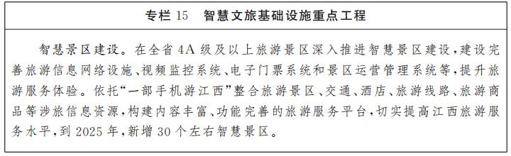 智慧文旅基礎(chǔ)設(shè)施建設(shè)。推進(jìn)“一部手機(jī)游江西”建設(shè),依托全省智慧旅游大數(shù)據(jù)中心,橫向融合交通、商務(wù)、市場監(jiān)管、民航、鐵路、氣象等部門涉旅數(shù)據(jù),縱向歸集省市縣及景區(qū)涉旅數(shù)據(jù),建成綜合性旅游智慧平臺。完善“云游江西”旅游推廣平臺并接入“贛服通”,將其打造成江西旅游宣傳推廣的官方助手。推進(jìn)4A級及以上旅游景區(qū)智慧化建設(shè),實現(xiàn)智能導(dǎo)游、電子講解、智能找?guī)?、智慧停車等功能全覆蓋。推動各級各類公共文化服務(wù)場館寬帶網(wǎng)絡(luò)全覆蓋,推進(jìn)數(shù)字圖書館、數(shù)字文化館、數(shù)字博物館和數(shù)字非物質(zhì)文化遺產(chǎn)等智慧場館建設(shè),提升公共數(shù)字文化服務(wù)水平。加快實現(xiàn)4A級及以上景區(qū)、重點公共文化服務(wù)場所5G信號全覆蓋。推動文化和旅游服務(wù)應(yīng)用場景智能化設(shè)施部署,運(yùn)用人機(jī)交互、VR/AR、全息等技術(shù)打造交互式文化體驗專區(qū),增強(qiáng)公共文化服務(wù)互動性和趣味性。
