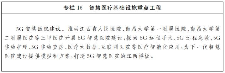 智慧醫(yī)療基礎(chǔ)設(shè)施建設(shè)。完善區(qū)域全民健康信息平臺,加強(qiáng)全民健康信息化互聯(lián)互通,促進(jìn)數(shù)據(jù)共享和業(yè)務(wù)協(xié)同。完善城鄉(xiāng)三級醫(yī)療服務(wù)網(wǎng)絡(luò),促進(jìn)“縣鄉(xiāng)一體、鄉(xiāng)村一體”。推動醫(yī)療機(jī)構(gòu)接入省級遠(yuǎn)程醫(yī)療服務(wù)平臺,構(gòu)建省市縣鄉(xiāng)四級遠(yuǎn)程醫(yī)療服務(wù)體系。促進(jìn)省域內(nèi)優(yōu)質(zhì)醫(yī)療資源擴(kuò)容和均衡布局,推進(jìn)省級區(qū)域醫(yī)療中心建設(shè)。鼓勵有條件的公立醫(yī)院、醫(yī)聯(lián)體建設(shè)互聯(lián)網(wǎng)醫(yī)院,重點打造省級、設(shè)區(qū)市級互聯(lián)網(wǎng)醫(yī)院。鼓勵醫(yī)院加快院內(nèi)系統(tǒng)上云和集成整合,構(gòu)建集醫(yī)療、服務(wù)、管理“三位一體”的智慧醫(yī)院系統(tǒng)。創(chuàng)新“5G+醫(yī)療”“VR+醫(yī)療”等新模式應(yīng)用,加快電子健康碼應(yīng)用,鼓勵各地開展AI輔助診療平臺和智能醫(yī)療影像云建設(shè),推進(jìn)江西特色智慧醫(yī)療建設(shè)。