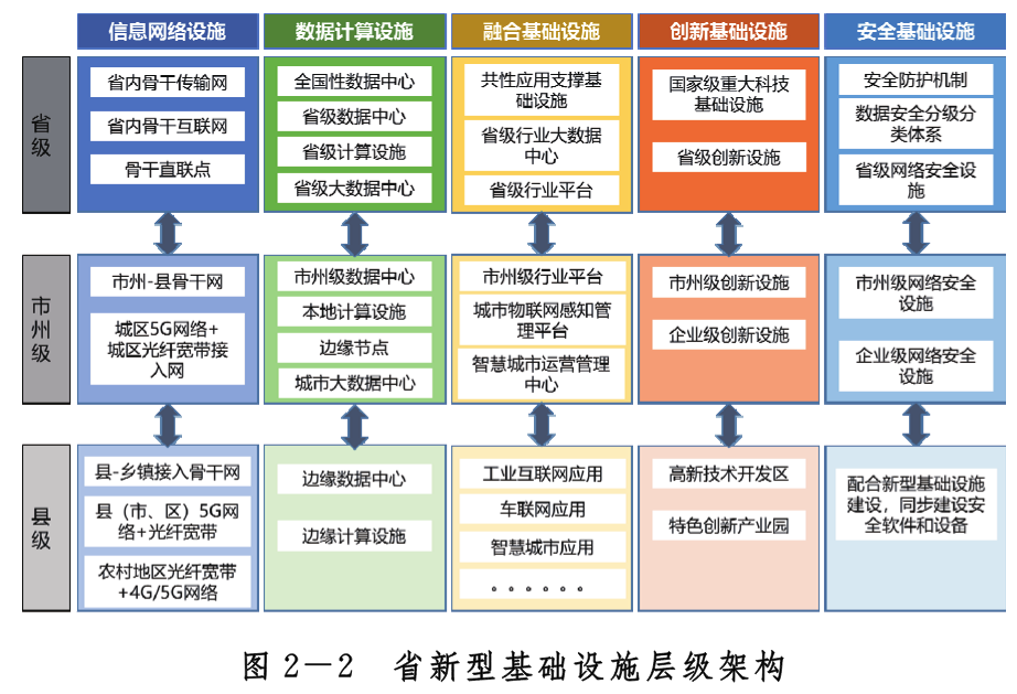 按照省、市州、縣(市、區(qū))分層統(tǒng)籌構(gòu)建信息網(wǎng)絡(luò)設(shè)施、計(jì)算存儲(chǔ)設(shè)施、融合基礎(chǔ)設(shè)施、創(chuàng)新基礎(chǔ)設(shè)施和安全基礎(chǔ)設(shè)施。