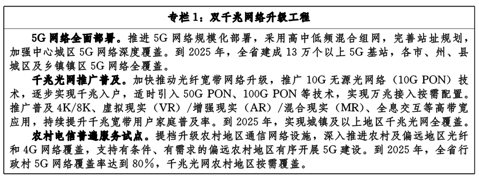 縣級(jí)層面。建設(shè)完善縣—鄉(xiāng)鎮(zhèn)接入骨干網(wǎng),加快推進(jìn)縣(市、區(qū))5G網(wǎng)絡(luò)和千兆光網(wǎng)覆蓋,有序推進(jìn)行政村5G網(wǎng)絡(luò)和千兆光網(wǎng)建設(shè)??h(市、區(qū))主要根據(jù)需求建設(shè)邊緣數(shù)據(jù)中心和邊緣計(jì)算設(shè)施。積極參與市州級(jí)融合基礎(chǔ)設(shè)施建設(shè),充分利用省、市州共性支撐能力,發(fā)展智慧化特色應(yīng)用。結(jié)合各地特點(diǎn)建設(shè)高新技術(shù)開(kāi)發(fā)區(qū)、特色產(chǎn)業(yè)園等創(chuàng)新設(shè)施載體。配合新型基礎(chǔ)設(shè)施建設(shè),同步建設(shè)網(wǎng)絡(luò)安全防護(hù)軟件和設(shè)備。