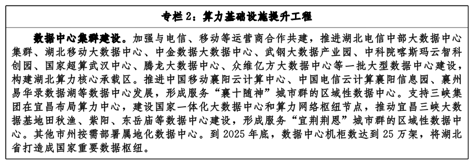 加快建設(shè)大型超大型數(shù)據(jù)中心,提升全省數(shù)據(jù)存儲(chǔ)計(jì)算能力。統(tǒng)籌規(guī)劃全省數(shù)據(jù)中心資源,依托中國(guó)寶武集團(tuán)、三峽集團(tuán)、中國(guó)水電集團(tuán)等龍頭企業(yè),推進(jìn)武漢、襄陽(yáng)、宜昌等大數(shù)據(jù)中心集群建設(shè)。推進(jìn)智能計(jì)算基礎(chǔ)設(shè)施布局,提升數(shù)據(jù)中心多任務(wù)負(fù)載能力和海量異構(gòu)數(shù)據(jù)計(jì)算能力,推動(dòng)傳統(tǒng)數(shù)據(jù)中心向人工智能計(jì)算中心演進(jìn),持續(xù)推動(dòng)武漢人工智能計(jì)算中心能力提升。加快構(gòu)建云邊協(xié)同的算力體系,推動(dòng)在智能制造示范園區(qū)(或企業(yè))按需建設(shè)邊緣計(jì)算節(jié)點(diǎn)或邊緣計(jì)算網(wǎng)關(guān),縣(市、區(qū))建設(shè)規(guī)模適度、共建共享的通用型邊緣計(jì)算資源池,滿(mǎn)足低時(shí)延業(yè)務(wù)的需求。推動(dòng)數(shù)據(jù)中心高質(zhì)量發(fā)展,新建數(shù)據(jù)中心電能使用效率(PUE)不高于1.3,對(duì)現(xiàn)有數(shù)據(jù)中心進(jìn)行綠色化改造,改造后PUE不高于1.6。