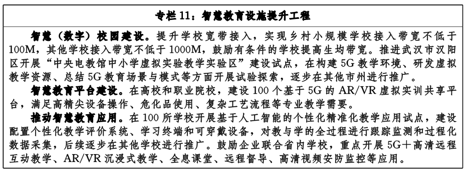 推進(jìn)智慧校園建設(shè)。加快建設(shè)在線(xiàn)智能教室、智能實(shí)驗(yàn)室、虛擬工廠、數(shù)字圖書(shū)館等智能學(xué)習(xí)空間,形成泛在化、智能化學(xué)習(xí)體系。推進(jìn)創(chuàng)客教室、虛擬仿真實(shí)驗(yàn)室、綜合教育教室等智能化教學(xué)環(huán)境建設(shè)。優(yōu)化升級(jí)學(xué)校網(wǎng)絡(luò)接入和帶寬條件,推動(dòng)5G網(wǎng)絡(luò)覆蓋校園,實(shí)現(xiàn)全省各級(jí)各類(lèi)學(xué)校數(shù)字校園全覆蓋。開(kāi)展智慧教育試點(diǎn)示范,探索基于人工智能的教育教學(xué)和教育管理模式,重點(diǎn)推進(jìn)武漢市創(chuàng)建國(guó)家智慧教育示范區(qū)。