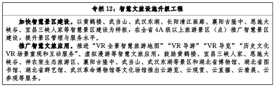 推進(jìn)智慧景區(qū)建設(shè)。全省4A級(jí)以上旅游景區(qū)(點(diǎn))深入推進(jìn)“智慧景區(qū)”建設(shè),建設(shè)完善景區(qū)預(yù)約服務(wù)平臺(tái)、視頻監(jiān)控系統(tǒng)、電子票務(wù)系統(tǒng)、智慧停車(chē)系統(tǒng)、流量監(jiān)測(cè)系統(tǒng)、景區(qū)數(shù)據(jù)資料應(yīng)用平臺(tái)、應(yīng)急管理平臺(tái)、一鍵報(bào)警系統(tǒng)和景區(qū)智能調(diào)度應(yīng)用平臺(tái)等,提升旅游服務(wù)體驗(yàn)。加快5G網(wǎng)絡(luò)在景區(qū)、景區(qū)道路覆蓋。結(jié)合5G、大數(shù)據(jù)、人工智能、AR/VR等技術(shù),率先在武漢、襄陽(yáng)、宜昌、咸寧、十堰、黃岡、恩施、神農(nóng)架等地建成一批數(shù)字虛擬景區(qū),豐富虛擬旅游內(nèi)容層次,立體展現(xiàn)湖北自然風(fēng)貌、人文歷史、風(fēng)土民情等特色。支持旅游景區(qū)利用網(wǎng)絡(luò)直播、AR/VR等開(kāi)展線(xiàn)上旅游,引導(dǎo)在線(xiàn)旅游企業(yè)開(kāi)發(fā)更多符合市場(chǎng)需求的網(wǎng)絡(luò)旅游套餐。