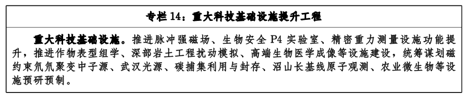 推進(jìn)脈沖強(qiáng)磁場(chǎng)、作物表型組學(xué)、深部巖土工程擾動(dòng)模擬、精密重力測(cè)量、生物安全P4實(shí)驗(yàn)室、高端生物醫(yī)學(xué)成像等6個(gè)重大科技基礎(chǔ)設(shè)施優(yōu)化提升或加快建設(shè),統(tǒng)籌謀劃磁約束氘氘聚變中子源、武漢光源、農(nóng)業(yè)微生物、碳捕集利用與封存、沼山長(zhǎng)基線(xiàn)原子觀測(cè)等重大科技基礎(chǔ)設(shè)施預(yù)研預(yù)制。