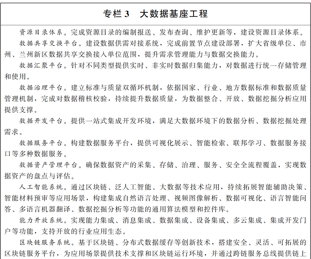 ——打造賦能特色數(shù)字政府。聚焦甘肅數(shù)字政府特色品牌建設(shè),深化區(qū)塊鏈應(yīng)用,加快推進(jìn)公共數(shù)據(jù)開放共享和數(shù)據(jù)標(biāo)準(zhǔn)化建設(shè),深度應(yīng)用于政務(wù)服務(wù)、城市管理、民生服務(wù)等方面,數(shù)據(jù)價(jià)值不斷凸顯,數(shù)字政府引領(lǐng)智慧城市、數(shù)字經(jīng)濟(jì)、數(shù)字社會發(fā)展。