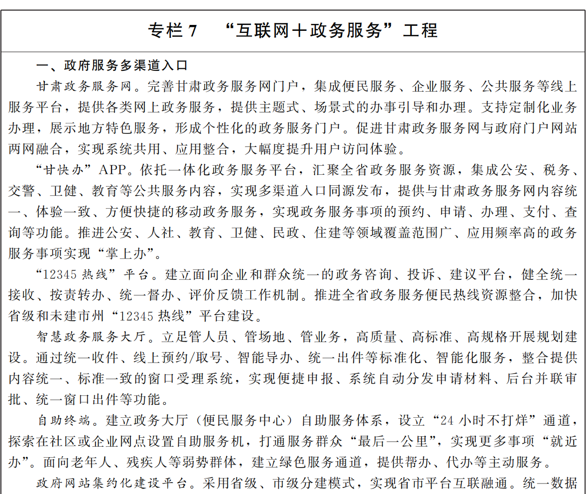 政務(wù)信息服務(wù)水平不斷提高。建成全省一體化政務(wù)服務(wù)平臺,“甘快辦”APP上線運(yùn)行。“不來即享”涉企政策精準(zhǔn)推送服務(wù)覆蓋全省中小微企業(yè)。投資、市場監(jiān)管、醫(yī)療、教育、旅游、水利等領(lǐng)域信息化平臺建設(shè)不斷完善,全省公安大數(shù)據(jù)建設(shè)及應(yīng)用進(jìn)入全國第一方陣。