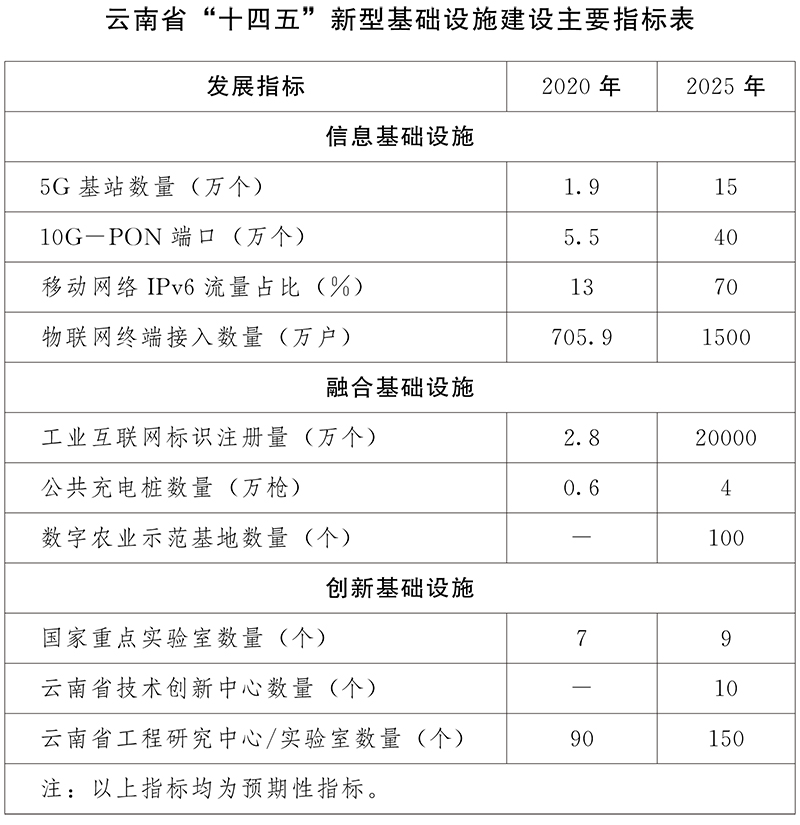 到2025年,初步構(gòu)建系統(tǒng)完備、高效實用、智能綠色、安全可靠的新型基礎(chǔ)設(shè)施體系,信息基礎(chǔ)設(shè)施建設(shè)實現(xiàn)快速發(fā)展,工業(yè)互聯(lián)網(wǎng)、智慧能源、智慧旅游等融合基礎(chǔ)設(shè)施領(lǐng)域建成一批全國標桿,創(chuàng)新基礎(chǔ)設(shè)施建設(shè)水平顯著提升,新型基礎(chǔ)設(shè)施成為數(shù)字云南建設(shè)和云南高質(zhì)量跨越式發(fā)展的重要支撐。