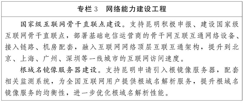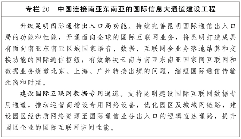 加強信息基礎(chǔ)設(shè)施互聯(lián)互通。建設(shè)中國連接南亞東南亞的國際信息大通道,加快推動跨境通信光纜建設(shè),持續(xù)擴容中緬、中老跨境光纜,推動建設(shè)中越河口—老街跨境國際通信線路。緊抓云南建設(shè)我國面向南亞東南亞輻射中心的機遇,積極推動昆明國際通信出入口局從語音、數(shù)據(jù)專線和互聯(lián)網(wǎng)轉(zhuǎn)接業(yè)務(wù)向全業(yè)務(wù)升級,著力推動昆明國際互聯(lián)網(wǎng)數(shù)據(jù)專用通道建設(shè),提升國際通信服務(wù)能力,促進外向型產(chǎn)業(yè)集聚。