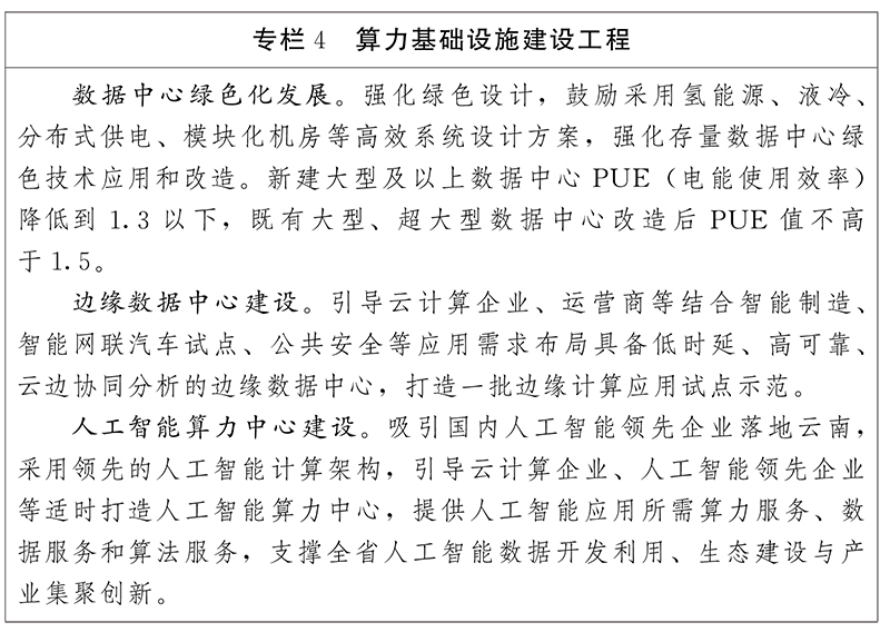 統(tǒng)籌全省算力基礎(chǔ)設(shè)施布局,結(jié)合實際應(yīng)用需要,加快大數(shù)據(jù)中心、人工智能算力中心、邊緣數(shù)據(jù)中心建設(shè)。打造云南一體化大數(shù)據(jù)中心體系,構(gòu)建布局均衡、協(xié)同供給、梯次連續(xù)的全省數(shù)據(jù)中心格局,積極融入國家一體化大數(shù)據(jù)中心體系。在昆明、玉溪、大理等地建設(shè)大數(shù)據(jù)中心省級樞紐節(jié)點,發(fā)展數(shù)據(jù)中心集群。支持曲靖、麗江、普洱、保山等地打造大數(shù)據(jù)中心次級節(jié)點,推動與全省大數(shù)據(jù)中心樞紐節(jié)點深度融合。支持邊緣數(shù)據(jù)中心建設(shè),打造一批滿足低時延、高可靠要求的邊緣計算應(yīng)用場景。積極引進國家級行業(yè)大數(shù)據(jù)中心落戶云南。部署人工智能算力中心,重點面向全省提供人工智能算力服務(wù),同時承接?xùn)|部地區(qū)算力需求外溢。完善數(shù)據(jù)中心發(fā)展配套環(huán)境,推動數(shù)據(jù)中心間高速度、大帶寬、低時延互聯(lián)網(wǎng)絡(luò)建設(shè)。鼓勵依法依規(guī)自主選擇參與電力市場化交易,降低用電成本。支持打造行業(yè)數(shù)據(jù)大腦,推動大數(shù)據(jù)在各行業(yè)各領(lǐng)域的融合應(yīng)用。