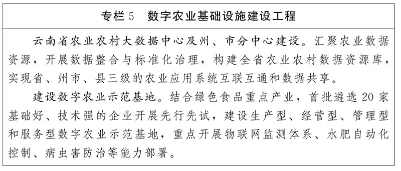 鼓勵農(nóng)業(yè)生產(chǎn)企業(yè)在農(nóng)業(yè)生產(chǎn)現(xiàn)場部署環(huán)境溫濕度、土壤水分、二氧化碳等各類傳感節(jié)點,支撐農(nóng)業(yè)生產(chǎn)環(huán)境感知預(yù)警、可視管理、決策分析。深入推進云南省農(nóng)業(yè)農(nóng)村大數(shù)據(jù)中心建設(shè),匯聚衛(wèi)星遙感、農(nóng)情氣象、物聯(lián)網(wǎng)采集等多渠道農(nóng)業(yè)數(shù)據(jù)。引導(dǎo)建設(shè)數(shù)字農(nóng)業(yè)示范基地、智慧農(nóng)業(yè)產(chǎn)業(yè)園區(qū)、智慧農(nóng)場、智慧農(nóng)產(chǎn)品生產(chǎn)保護區(qū)等載體,提升農(nóng)業(yè)生產(chǎn)、加工、銷售各環(huán)節(jié)數(shù)字化水平。推進農(nóng)村電商服務(wù)站點、農(nóng)產(chǎn)品倉儲保鮮冷鏈流通網(wǎng)絡(luò)設(shè)施的數(shù)字化、智能化改造升級。