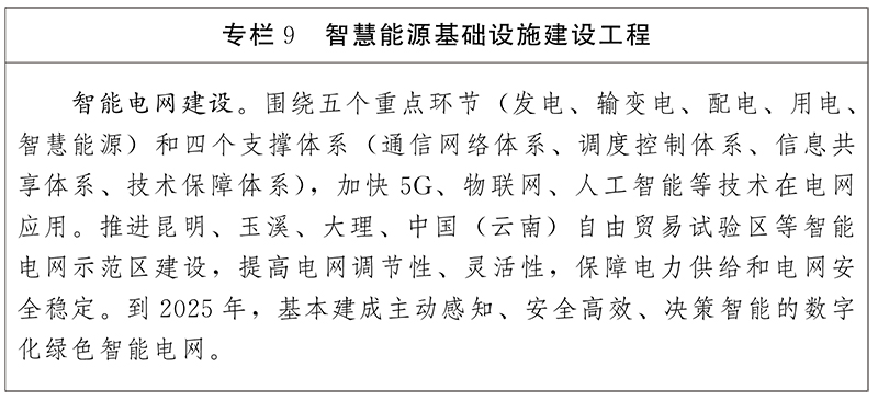 建設(shè)智能電網(wǎng)示范區(qū),推進電源、電網(wǎng)、負荷、儲能高效互動、動能電力協(xié)同互補、用能需求智能調(diào)控,精準匹配電力供需,提升電力系統(tǒng)平衡調(diào)節(jié)能力。依托文山等全省電力負荷中心,提升智慧電網(wǎng)能源負載和優(yōu)化調(diào)度能力。建設(shè)能源數(shù)據(jù)傳輸網(wǎng)絡(luò)和云南綠色能源大數(shù)據(jù)中心,聯(lián)通各地各部門以及有關(guān)能源企業(yè),及時、準確掌握全省能源運行數(shù)據(jù)。大力推廣“多表合一”,實現(xiàn)電、氣、熱等多種能源消費信息的遠程感知、傳輸匯聚。引導(dǎo)省內(nèi)煤炭企業(yè)積極發(fā)展現(xiàn)代化智能化煤礦,優(yōu)化井下布局、生產(chǎn)系統(tǒng),推廣新型生產(chǎn)模式,提升綜采綜掘數(shù)字化水平。
