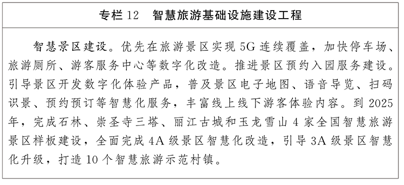 完善智慧文化旅游基礎(chǔ)設(shè)施。有序推進全省國家級及省級全域旅游示范區(qū)、旅游度假區(qū)、3A級以上景區(qū)等區(qū)域?qū)崿F(xiàn)5G連續(xù)覆蓋,保障大密度客流環(huán)境及偏遠旅游區(qū)域的通信設(shè)備信號暢通。加快推進景區(qū)智慧化改造,鼓勵酒店部署刷臉入住、自助前臺等智能服務(wù)以及智能家居產(chǎn)品,提升旅游數(shù)字化服務(wù)能力和水平。推進旅游大數(shù)據(jù)中心建設(shè),加快涉旅數(shù)據(jù)集中整合和開放共享。推進云南廣電大數(shù)據(jù)中心、智慧廣電融合媒體云、云上智慧云、云上文化云、“七彩云”智慧融媒體服務(wù)平臺等公共文化基礎(chǔ)設(shè)施建設(shè)。