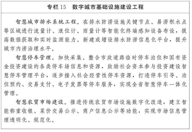 ——融合基礎(chǔ)設(shè)施建設(shè)邁上新臺階。建成100個數(shù)字農(nóng)業(yè)示范基地,培育5個國家工業(yè)互聯(lián)網(wǎng)應(yīng)用示范平臺,建成20個工業(yè)互聯(lián)網(wǎng)標識解析二級節(jié)點,建成一批智能電網(wǎng)示范區(qū),城鄉(xiāng)智能充電基礎(chǔ)設(shè)施全面覆蓋,旅游景區(qū)及服務(wù)場所數(shù)字化基礎(chǔ)設(shè)施建設(shè)取得顯著成效,物流數(shù)字化轉(zhuǎn)型深入推進。數(shù)字政府基礎(chǔ)設(shè)施服務(wù)能力顯著提升,數(shù)字生態(tài)監(jiān)測、治理效能大幅加強,全省數(shù)字化交通網(wǎng)、智慧應(yīng)急體系基本建成。民生數(shù)字化服務(wù)能力大幅提升,建成一批智慧醫(yī)院和智慧校園。數(shù)字鄉(xiāng)村基礎(chǔ)設(shè)施建設(shè)快速推進,創(chuàng)建一批數(shù)字城市試點示范,城市建設(shè)管理運營能力快速增強。