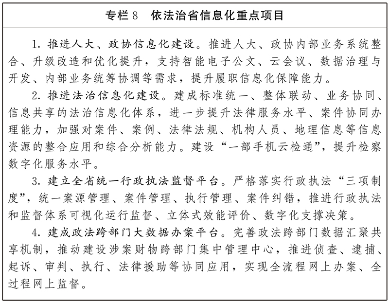 深化立法、監(jiān)督、協(xié)商、議政等業(yè)務(wù)應(yīng)用,完善人大代表、政協(xié)委員履職信息化應(yīng)用。構(gòu)建數(shù)據(jù)安全、集約高效的政法業(yè)務(wù)協(xié)同辦理平臺,提升“智慧法院”、“智慧檢務(wù)”、“智慧警務(wù)”、“智慧司法”應(yīng)用水平和協(xié)同能力,提高審判執(zhí)行、多元解紛、司法公開、法律監(jiān)督、刑罰執(zhí)行、法律服務(wù)、協(xié)同辦案的智能化水平。推動法治工作資源互聯(lián)互通、業(yè)務(wù)協(xié)同、信息共享,為依法治省提供決策支持。