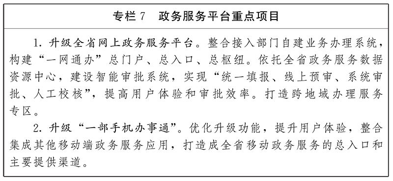 政務(wù)服務(wù)能力大幅提升。全省政務(wù)服務(wù)平臺更加易用、好用,政務(wù)服務(wù)“一網(wǎng)通辦”和標(biāo)準(zhǔn)化、規(guī)范化、便利化水平不斷提升;高頻民生政務(wù)服務(wù)事項實現(xiàn)“掌上辦”;非涉密政務(wù)服務(wù)事項網(wǎng)上可辦率達(dá)到99%,全程網(wǎng)辦和零跑動率達(dá)到90%以上。線上線下融合服務(wù)更加完善。